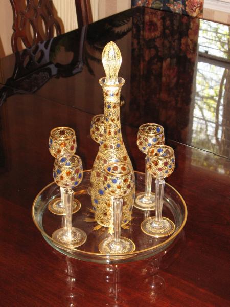 Glass and gold enamel cordial set with decanter, stopper, six small stems and tray. Has blue, rust and red polka dots.