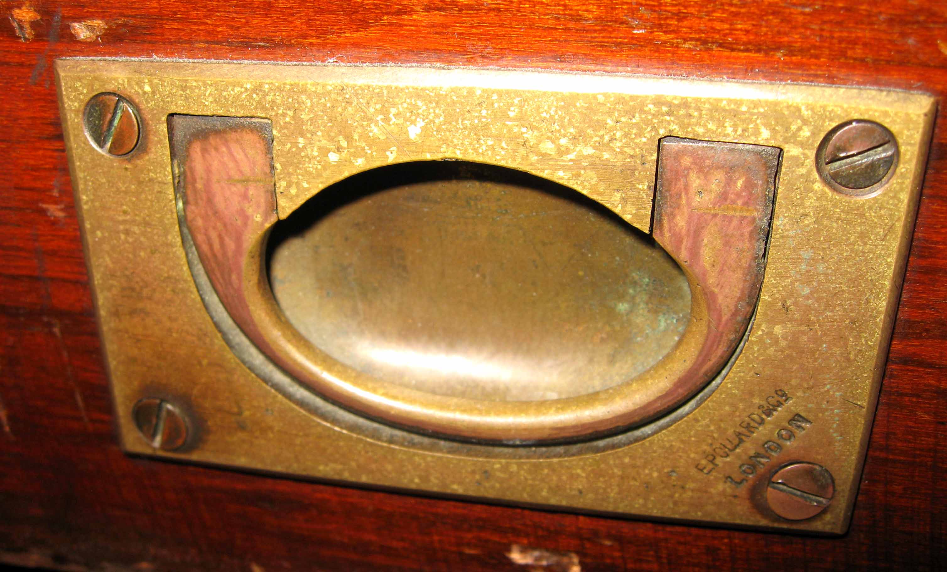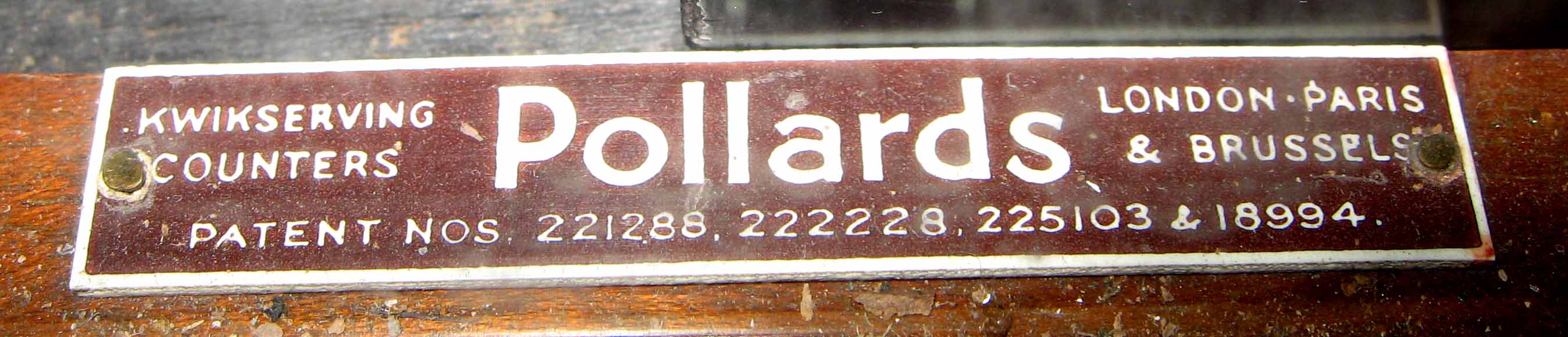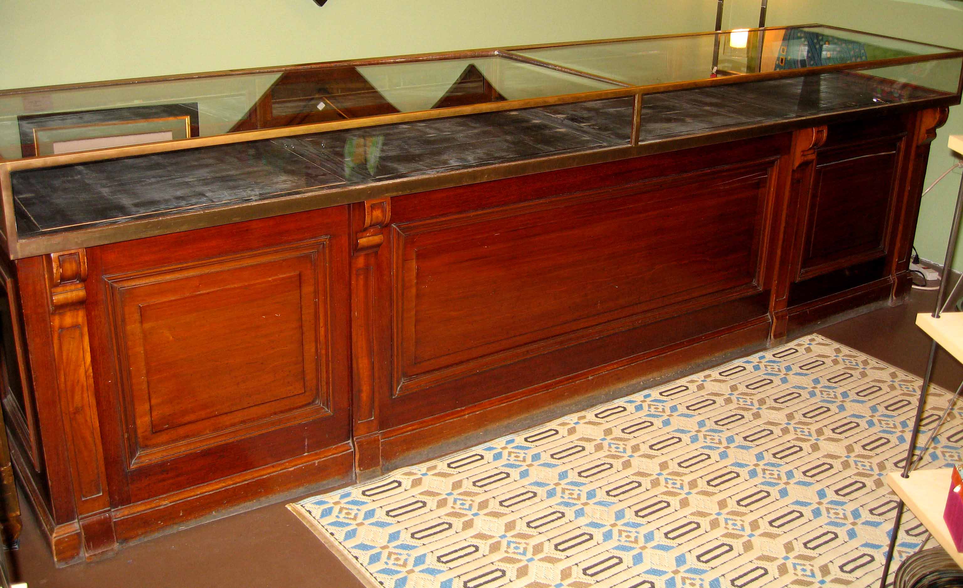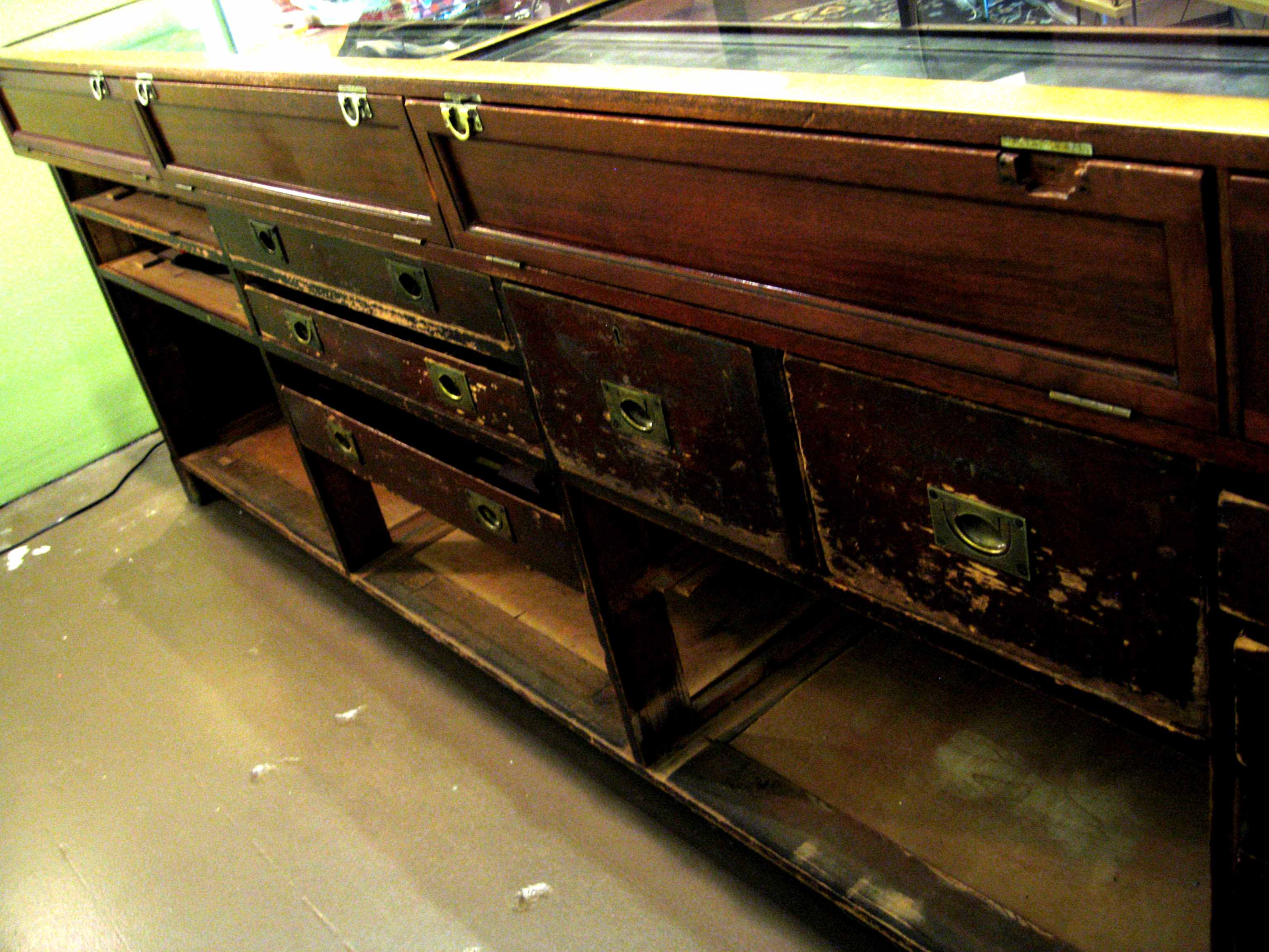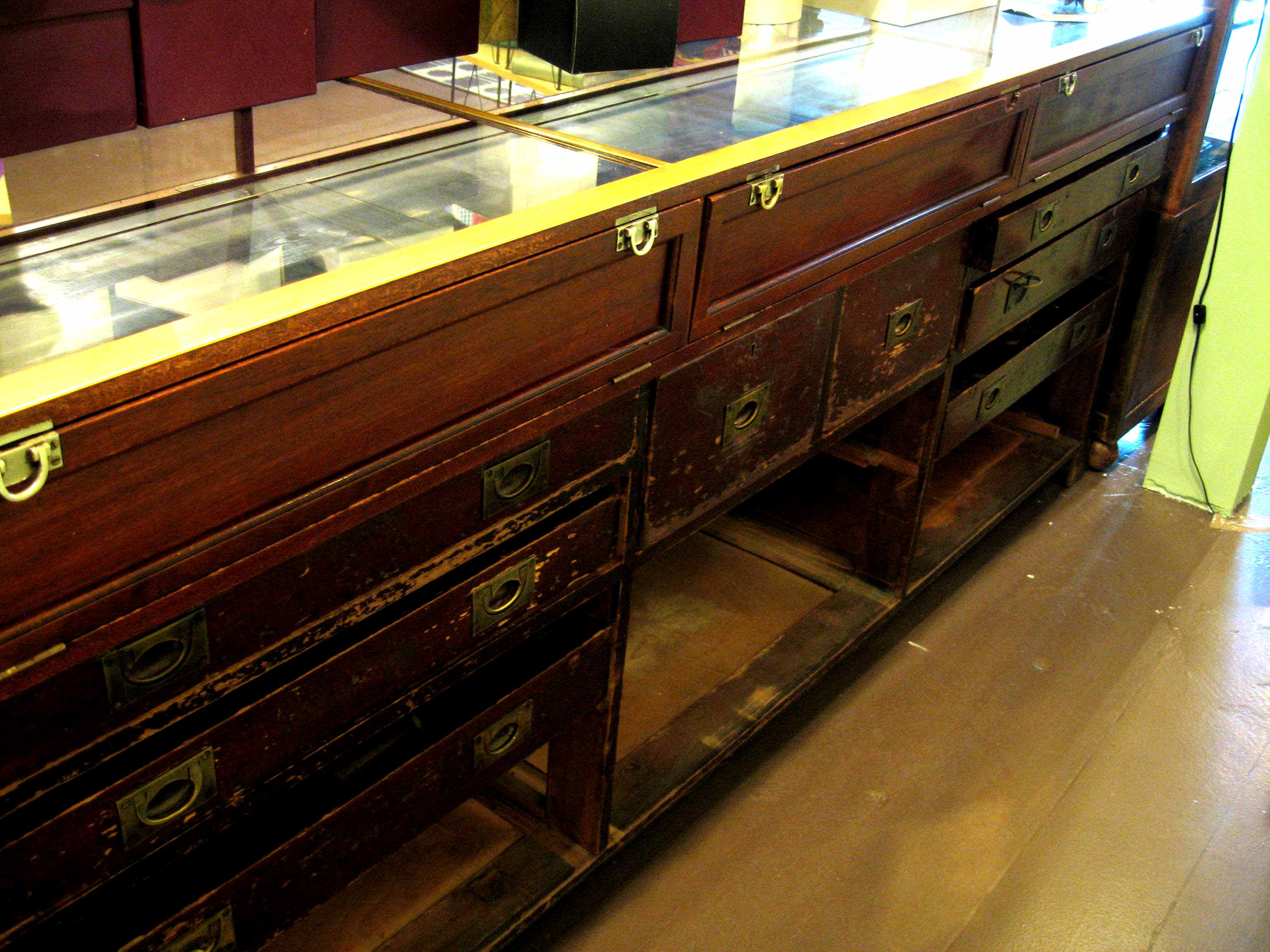 This display counter is quite a long piece. I’ve taken pictures of the front and back of this piece. Inside the glass display case (of which I have replaced the top glass with a piece of glass that was less scratched) there is a label indicating that it was manufactured by Pollards and it has a number of Patent numbers indicated. On the back of this piece, there are a number of drawers – some of which I think may be missing. Some of the drawers are wobbly when pulling them out. I also took a picture of one of the drawer handles – this particular handle has ‘Pollards & Co, London’ stamped into the brass. I don’t know any history behind this piece. I would just like to know an approximate value of this piece.