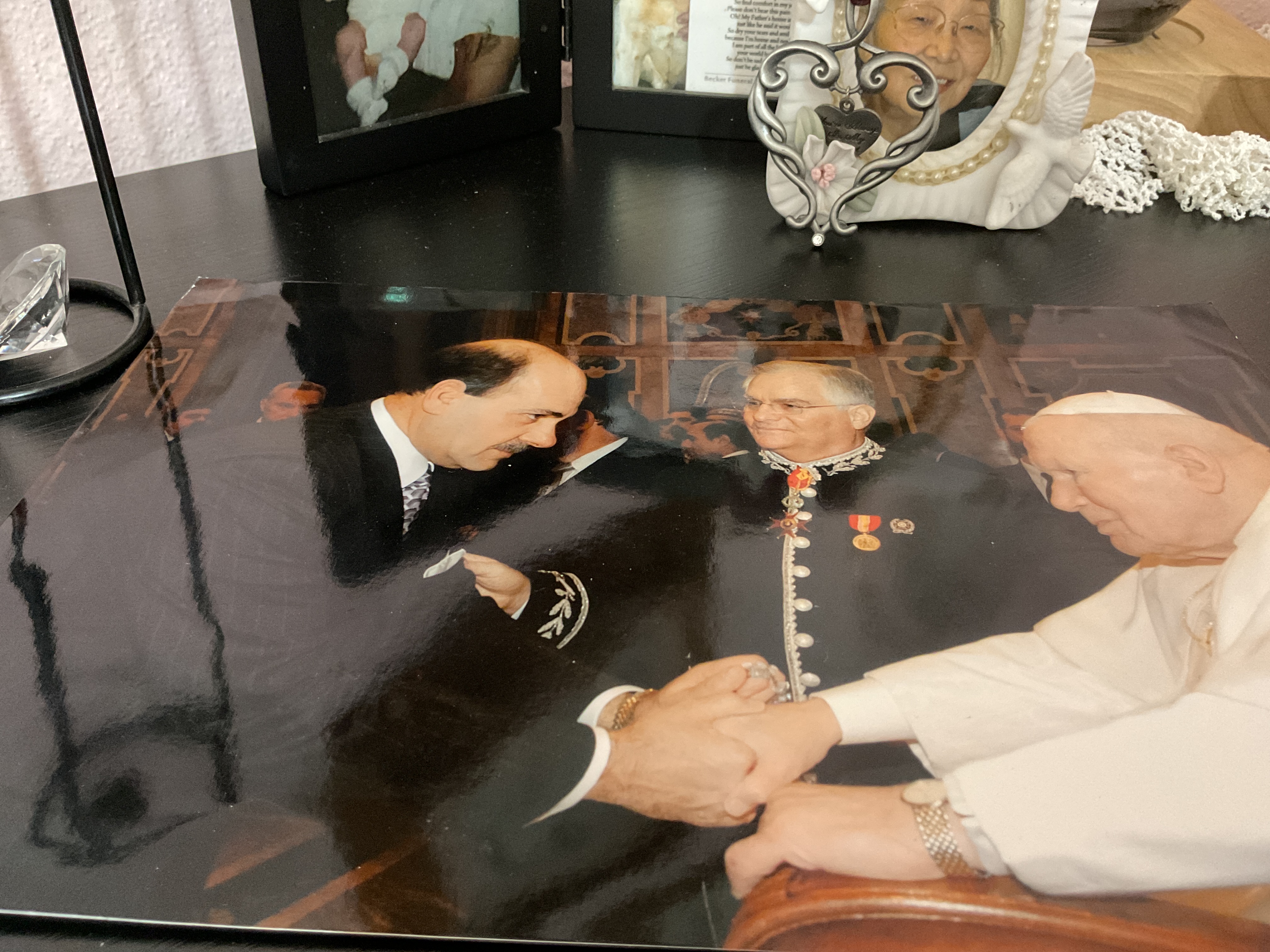 Physical Description: This item is a color photograph printed on photo paper, featuring Pope John Paul II shaking hands with a diplomat in the Vatican. The dimensions of the photograph are 8 inches by 10 inches. The image captures a significant moment, showcasing the Pope in his traditional white attire and the diplomat in formal wear.