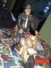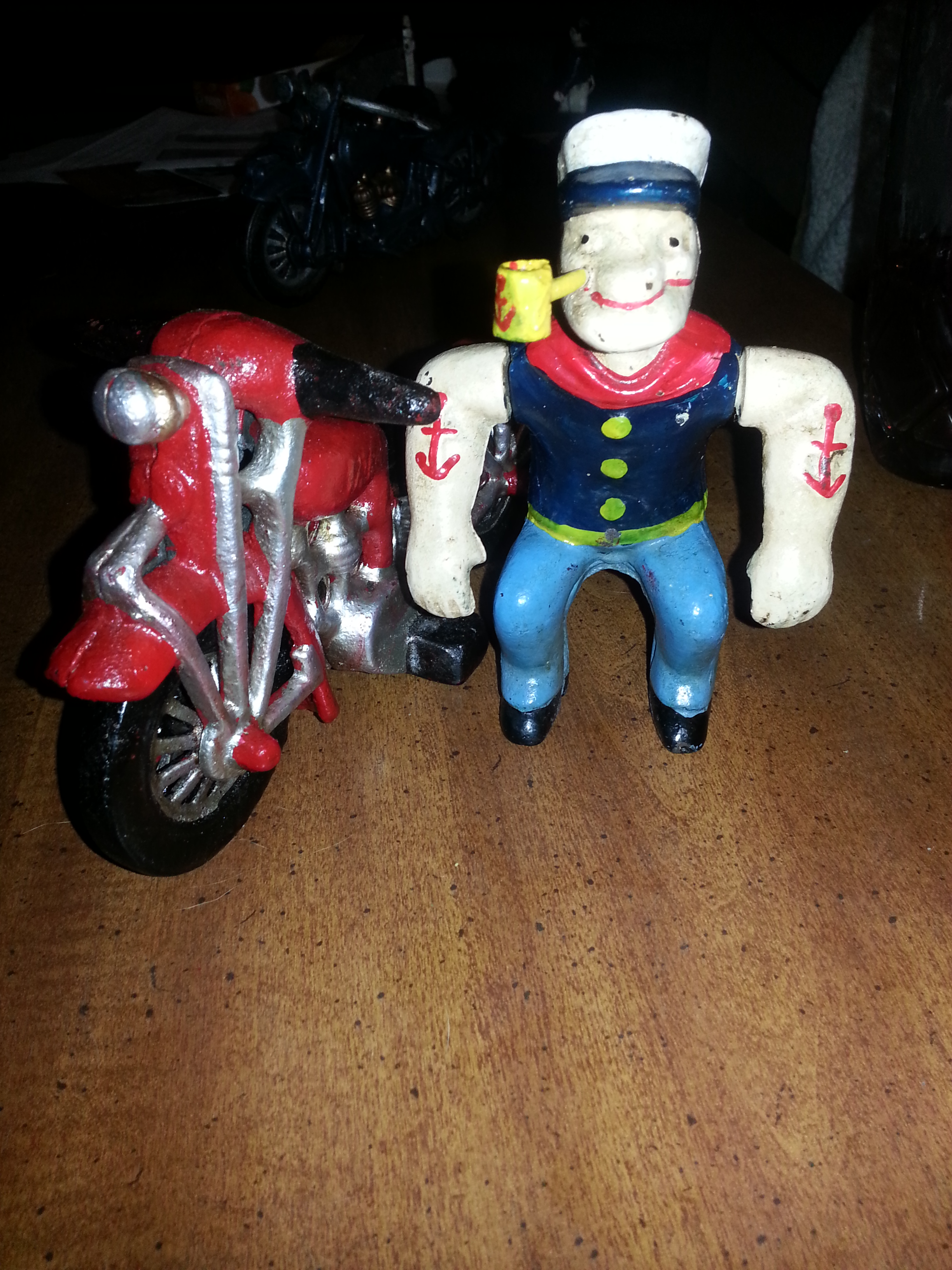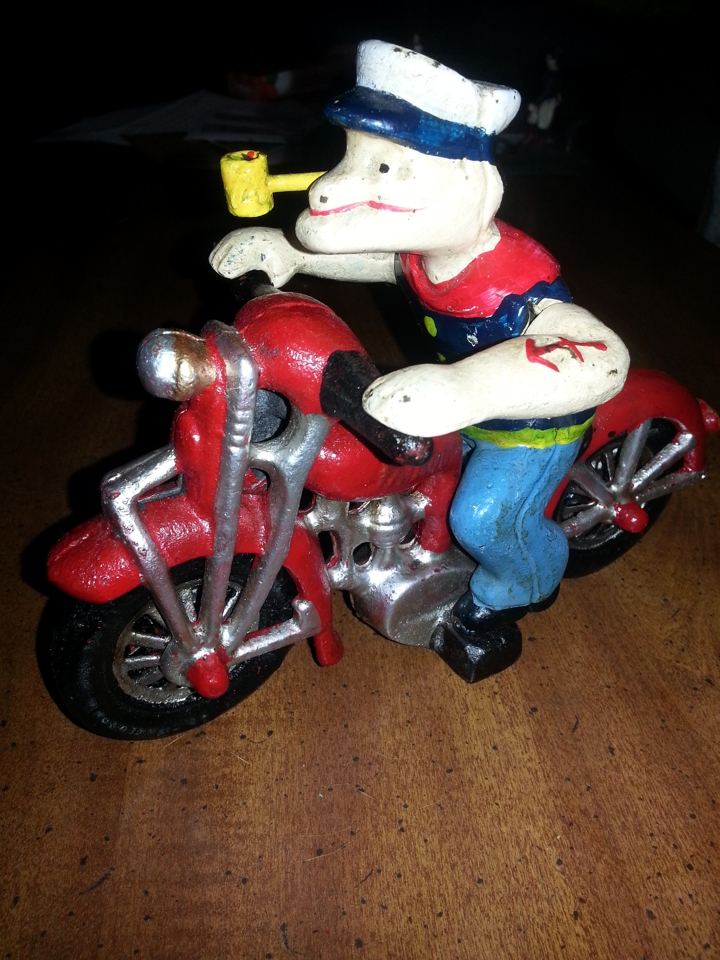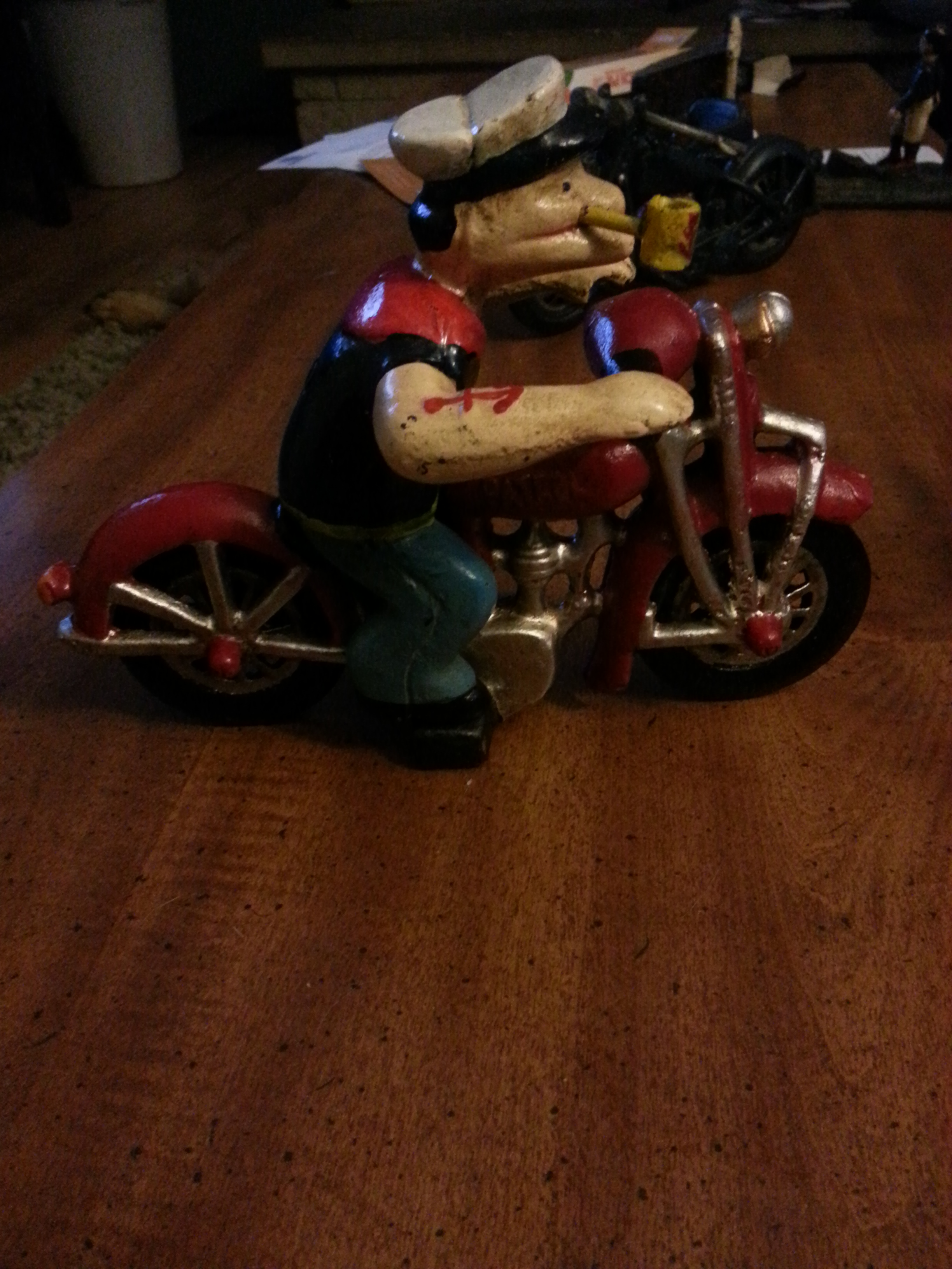 Two piece Popeye riding a motorcycle. Wheels move and Popeyes arms move.