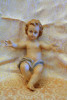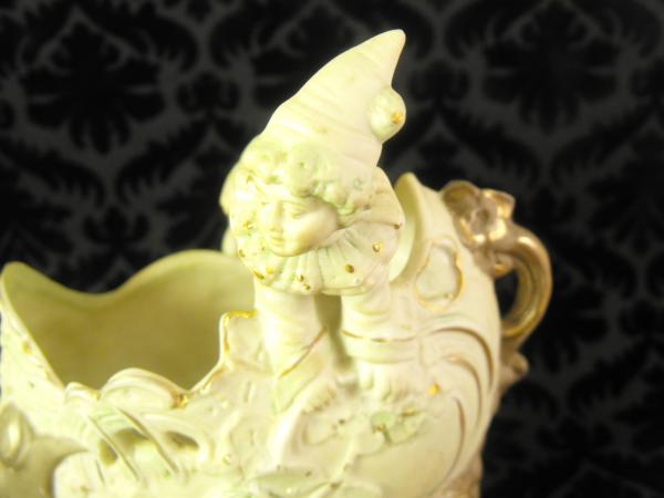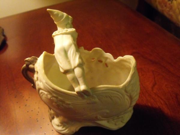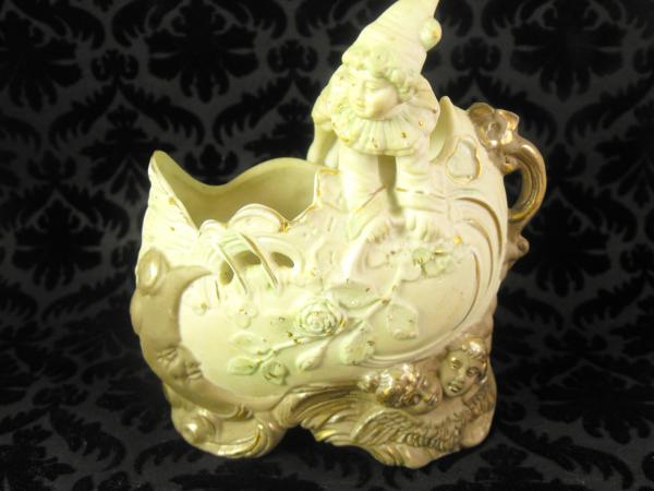 ceramic/porcelain basket with swirls, flowers and leaves on "front" moon on one side, two cherub faces lower right. Handle is of a child with ruffled collar, pointed hat and short pants, barefoot. hands on one side of basket and feet on the other. color is beige upperwith pale blue accents. Bottom part is a light brown. Gold accents all over piece. Small gold dots on leaves on front. No chips or cracks or repairs. In the picture, it appears that paint is missing from cherub's faces. This is actually a refection of the gold leaf. I have not cleaned it..not sure the safest way. I have never seen another like this and have been unsuccessful in my internet search. Thank you for your help. I am unsure if I want to sell it. Laura