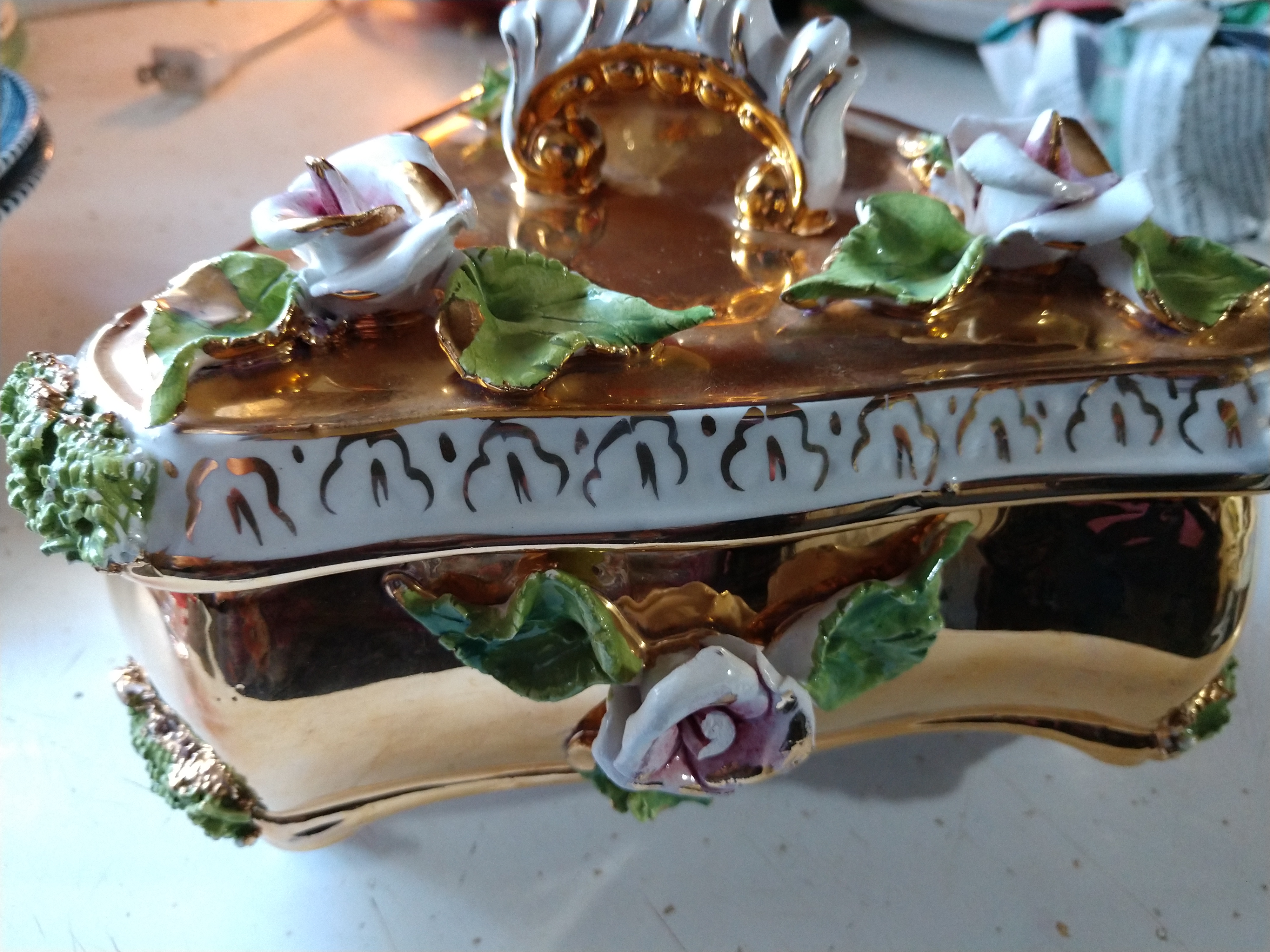 Triangular box, gold and multiple colors. About 8" across. Porcelain, marked Are. De Seresto italy, 1003/130/25 p.m. can't find anything like it on line.