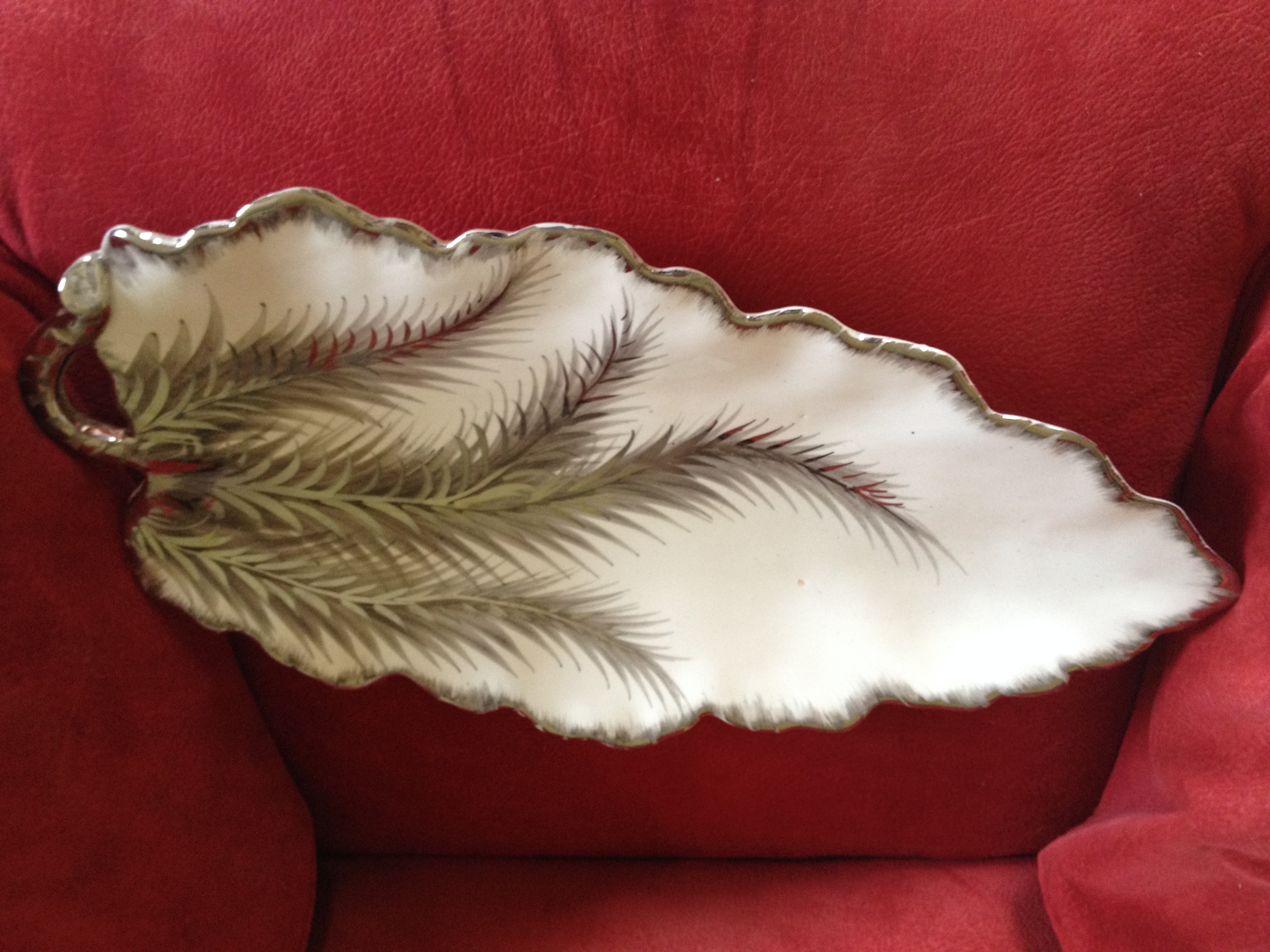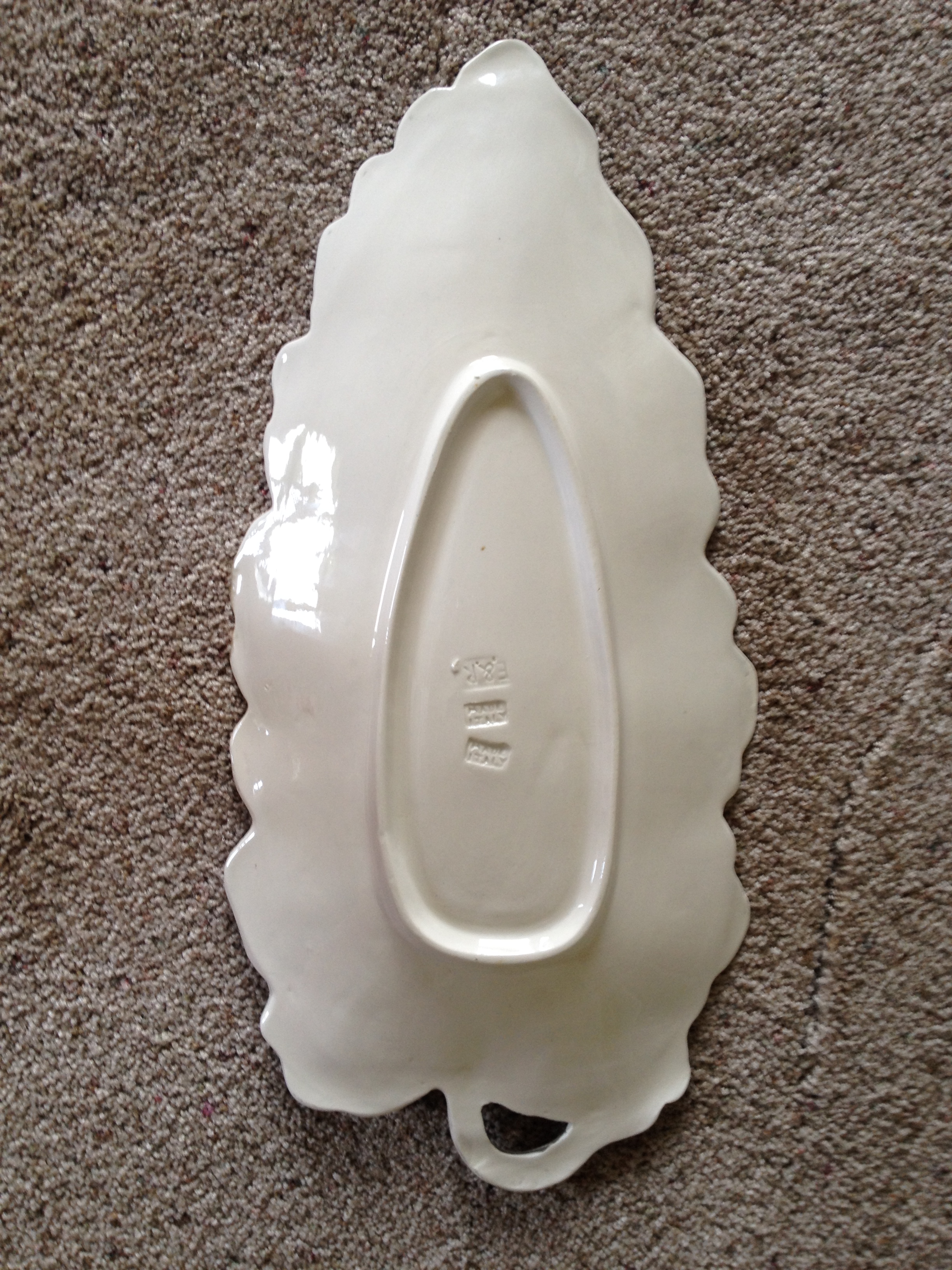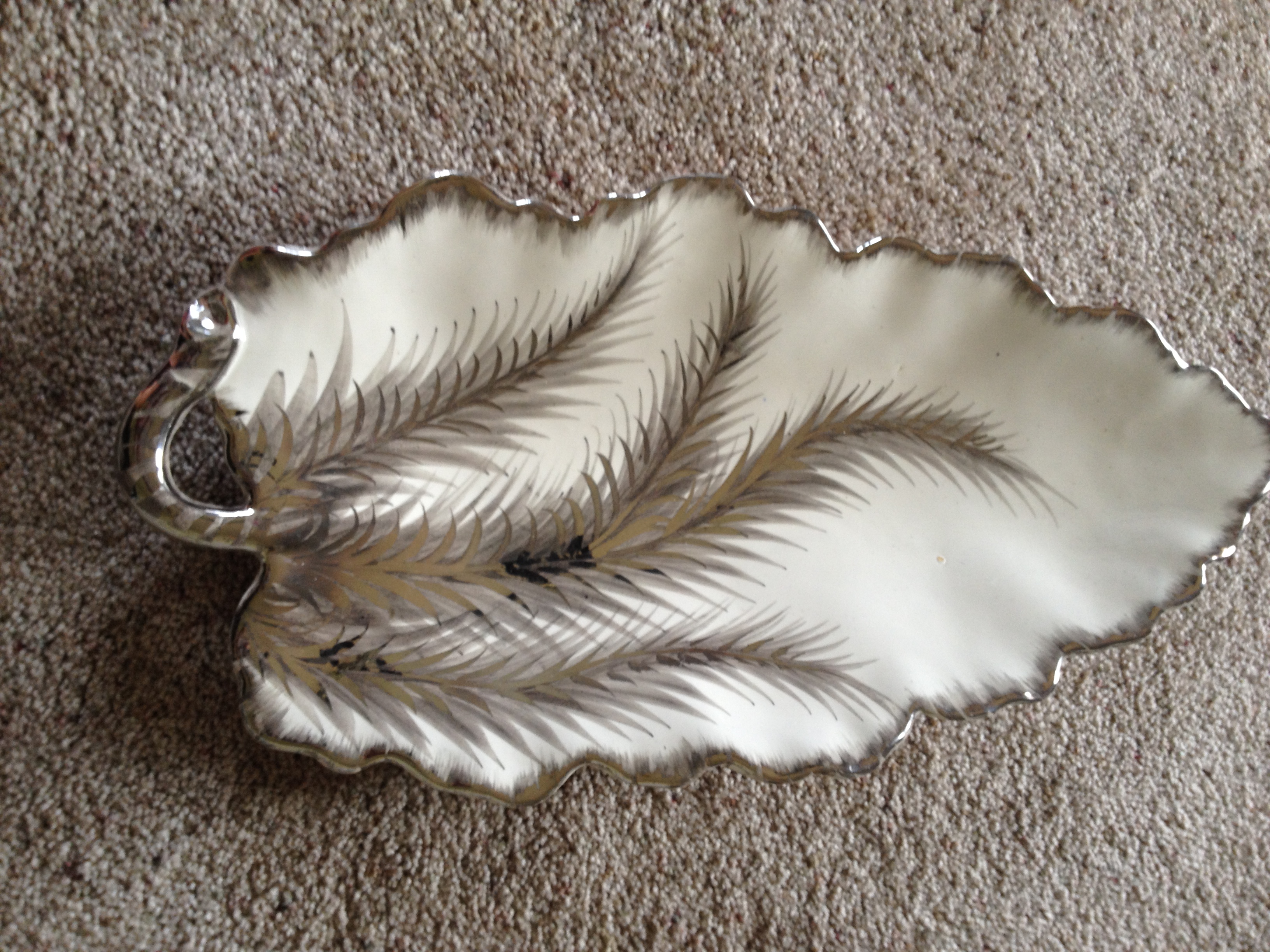White porcelain / china leaf shaped platter with silver trim. Back side has 3 separate markings