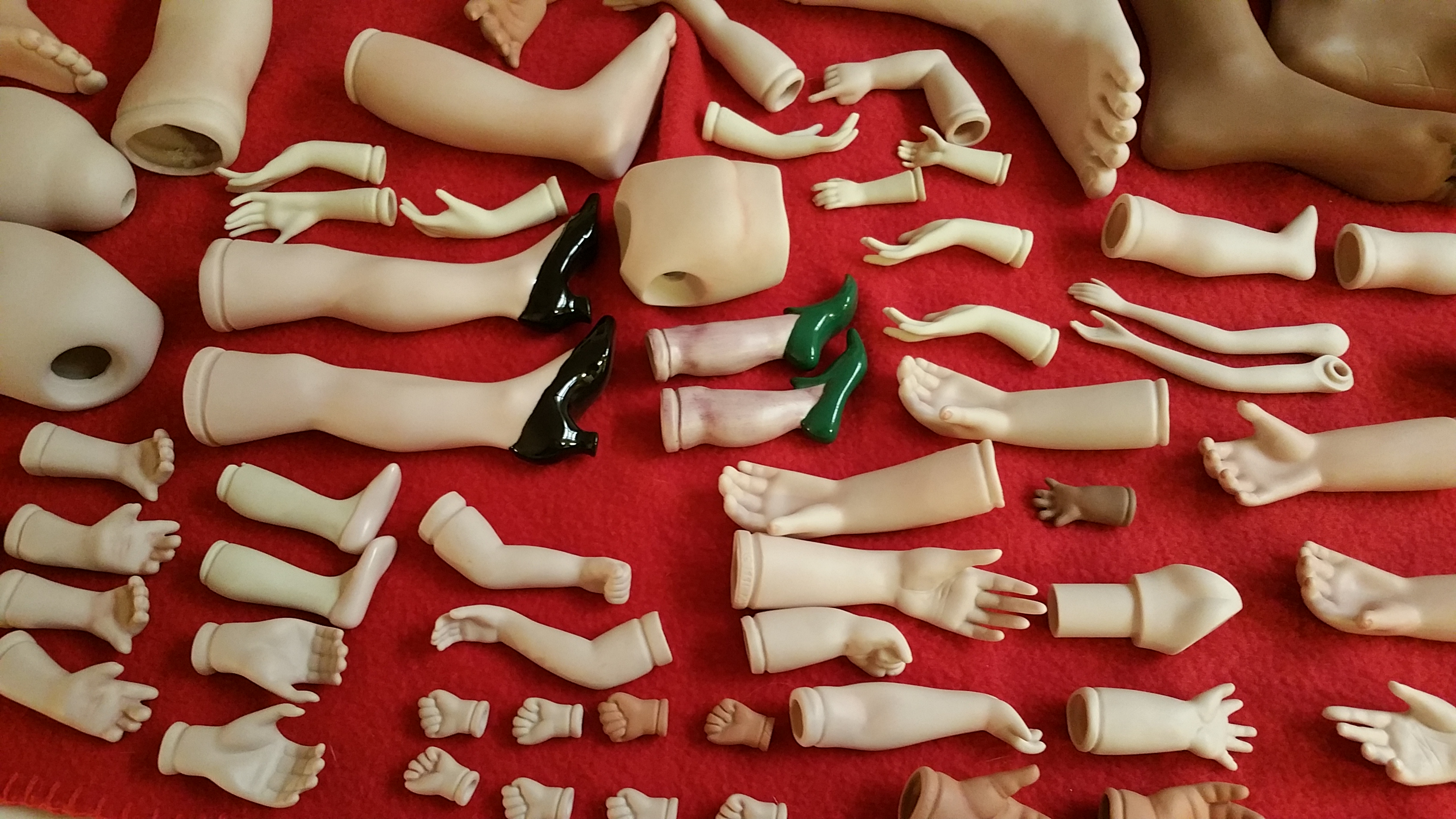 This is a large, meticulously preserved collection of over 250 unassembled porcelain doll parts dating from approximately 1982 to 1996. The collection includes a wide range of heads, torsos, arms, legs, hands, and feet in multiple skin tones and styles, ranging in size from roughly 1 inch to 10 inches. Notably, many heads have detailed, hand-painted facial features, some with inset acrylic or glass eyes and rooted eyelashes. Among the recognized artists/mold sources are: