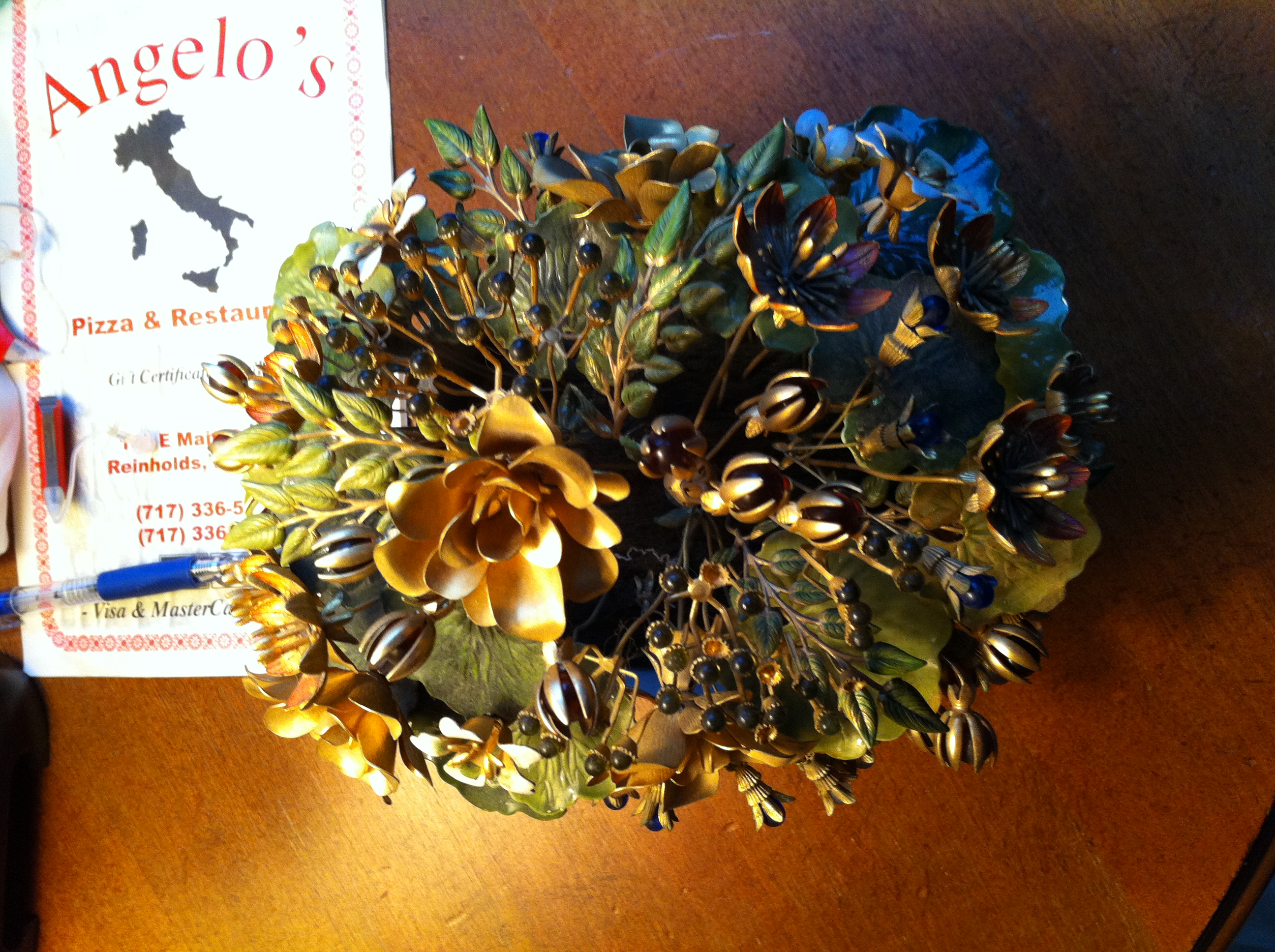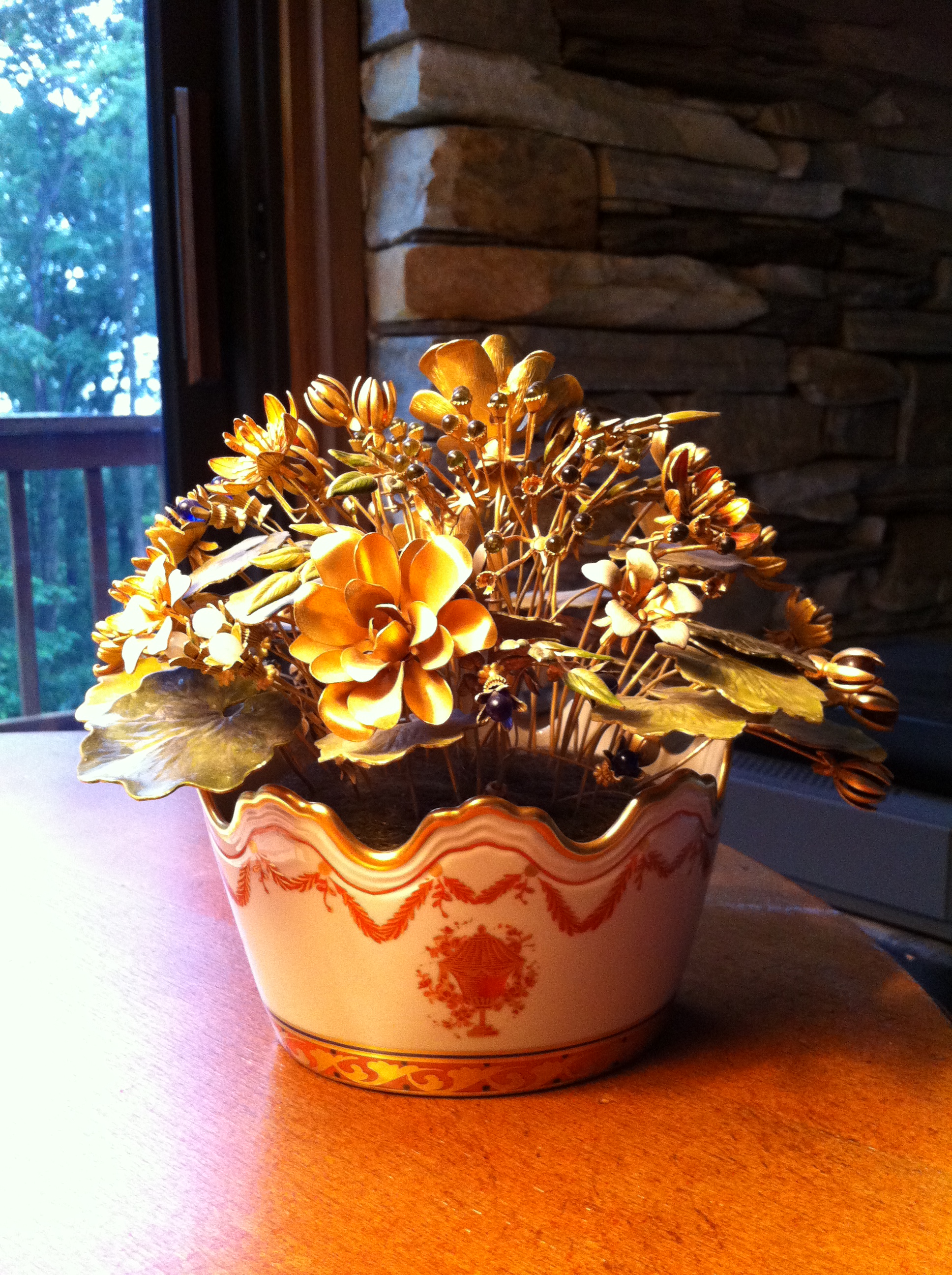 this is a decorative floral bouquet, made of copper wire, enameled leaves with stones used for flowers. The "vase" is white porcelain with gold edging.