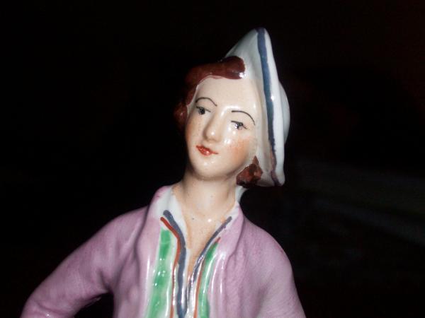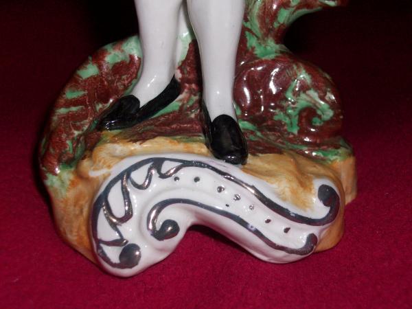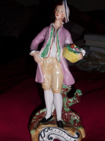 As you can see from the pics, it is a figure of a man carrying a basket of fruits or vegetables. There is a line of gilding around the brim of the hat, the sleeve cuffs, the front of the shirt, and the front of the base. The other colors used on the figure can be clearly seen in the photos, so won't go into detail.