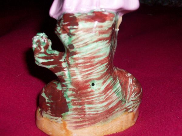 I believe this figure is made of porcelain, but I'm not sure how to tell porcelain from other ceramic materials, so cant be certain. The figure has two, very small 'pinholes' or air holes, one through the bottom on the underside of the base, and another through the tree trunk behind the figurines legs.
