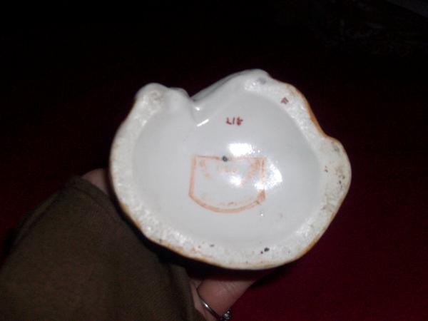 On bottom there are two very small, handpainted marks in dark red...one looks like "L18" and the other is a capital "F". There is also a stamped mark on bottom that reads "Old Staffordshire", but I believe this may have been added to the piece later, but thats just my hunch