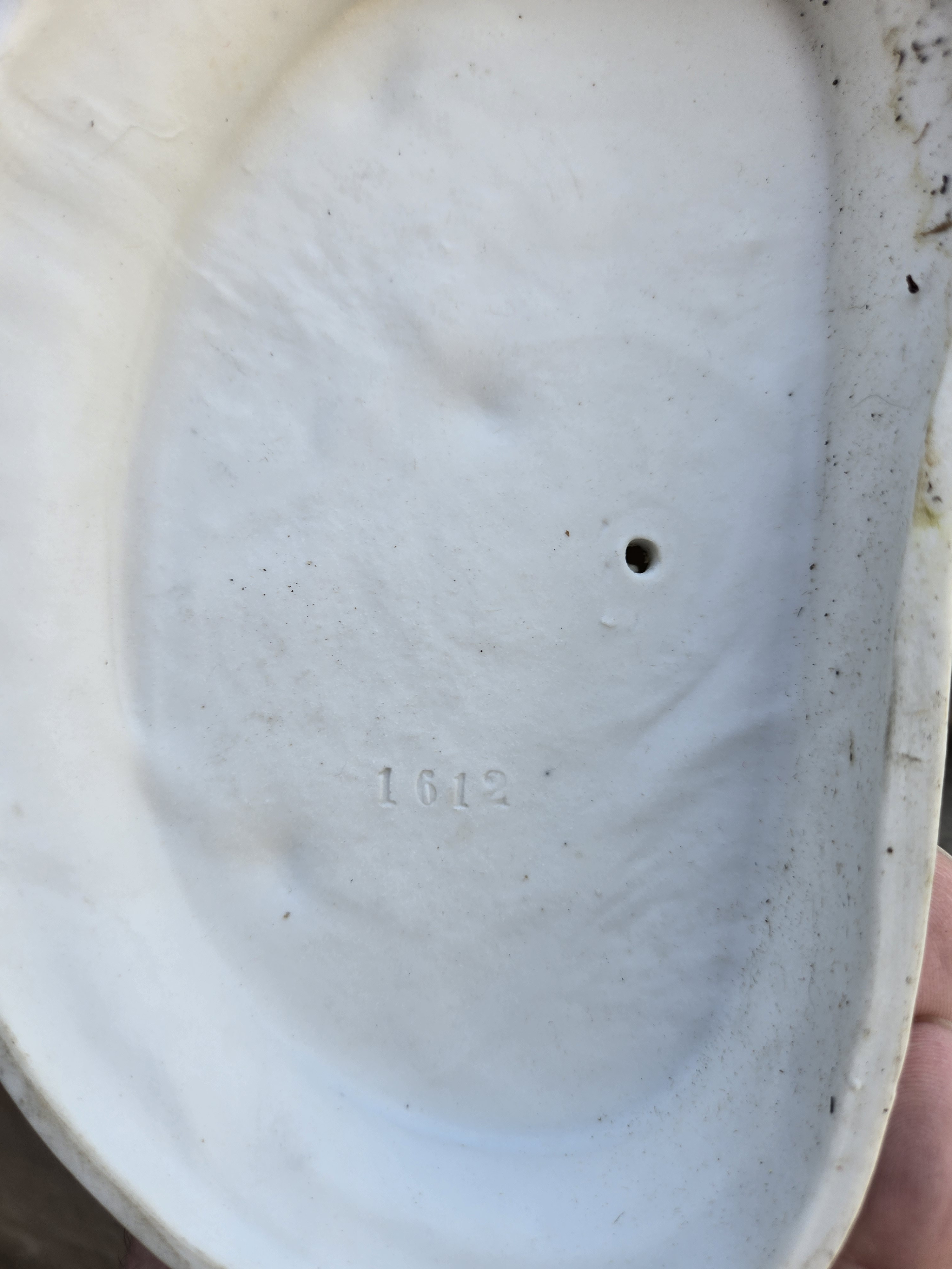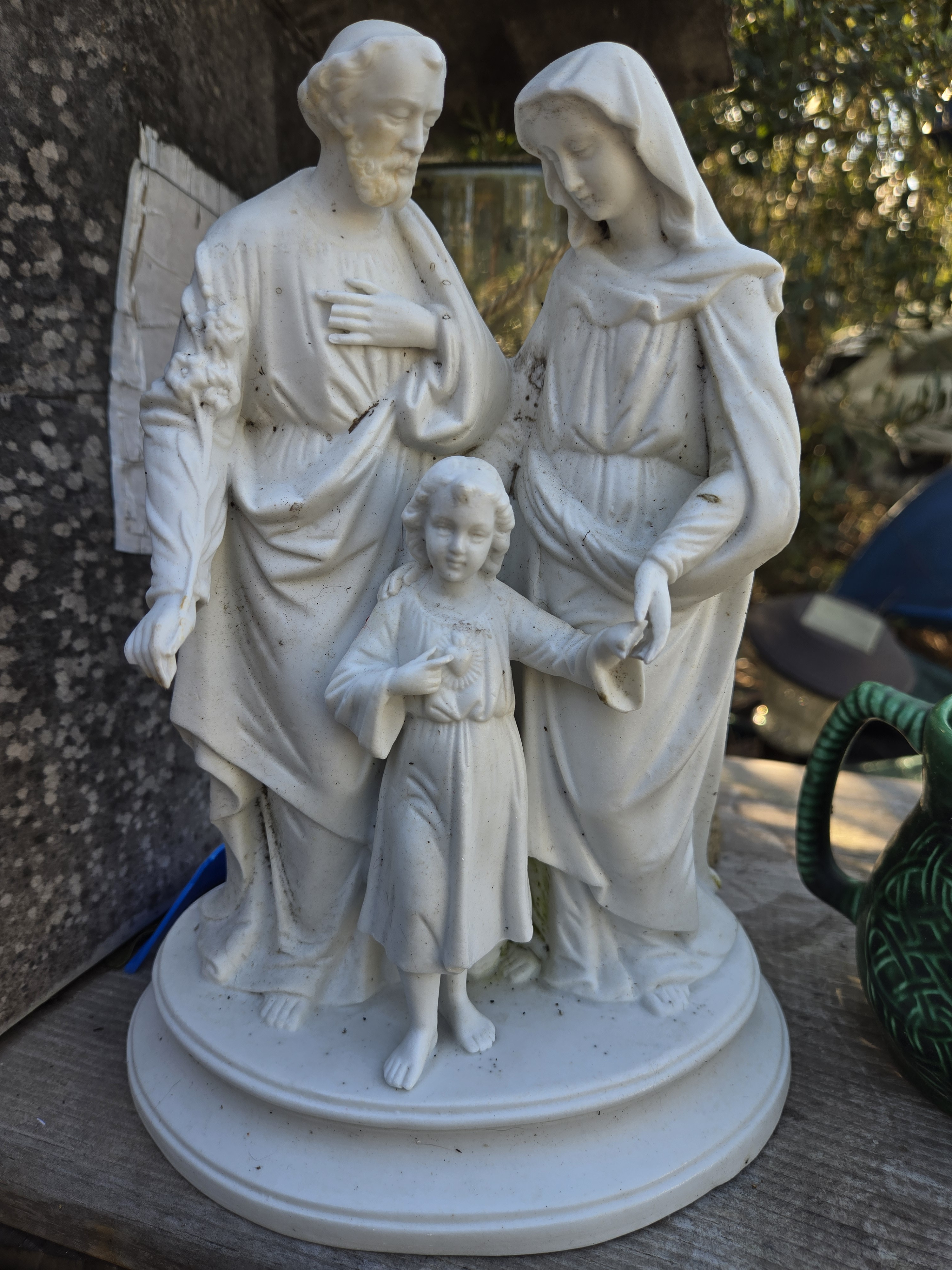 This piece is a white porcelain statue depicting the Holy Family: Joseph, Mary, and the child Jesus. It measures approximately 9.5 inches in height, 7 inches in width, and 4.5 inches in depth. The base is marked with the number “1612.” The statue shows evidence of minor damage: two fingers are missing from Joseph’s hand, and part of Jesus’s hand is chipped. Aside from these losses and some surface soiling, the figure remains in fair condition, with no major cracks or structural issues.