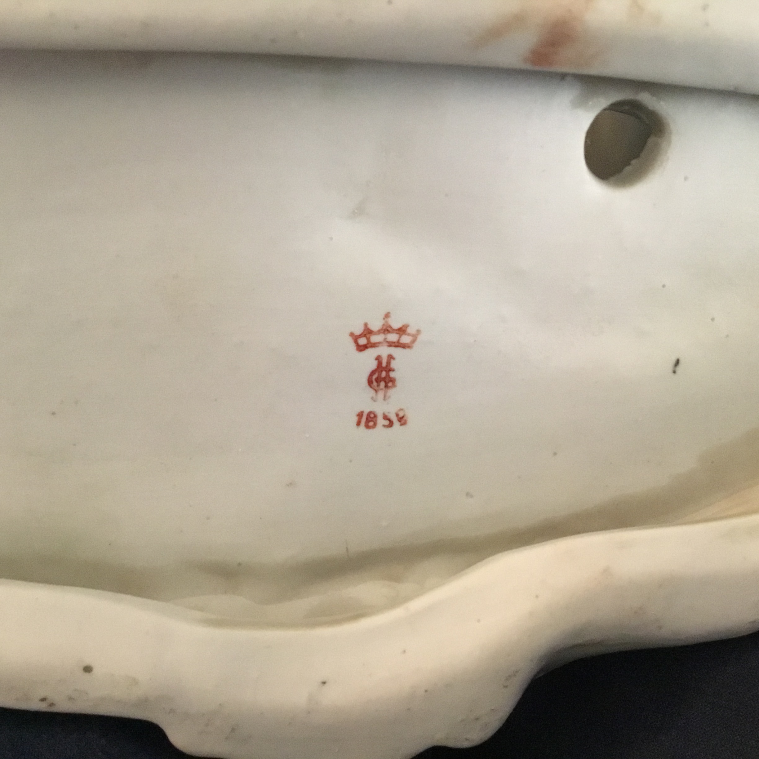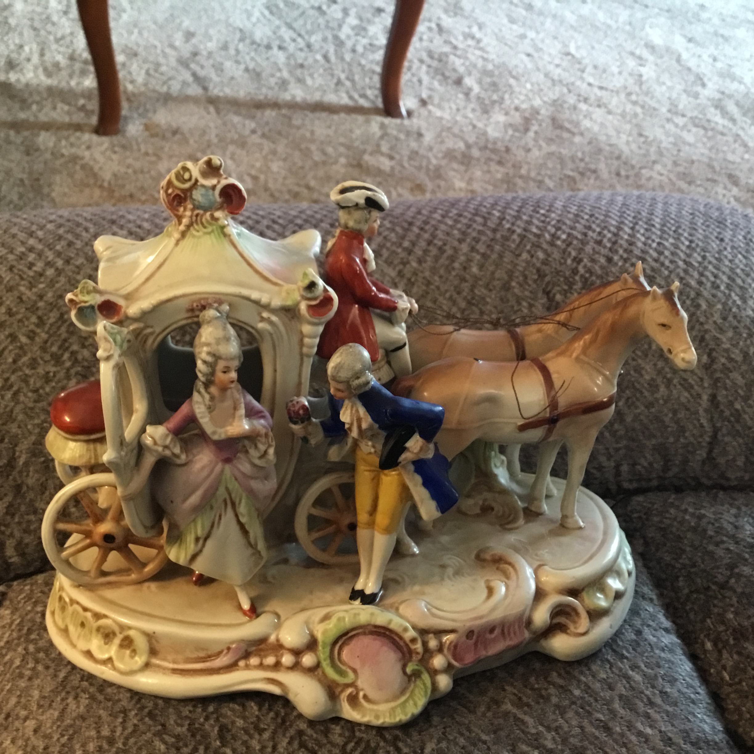 Horse drawn carriage with a man and a woman. Crown marking on bottom with # 1858 and another symbol. Germany 19437 on one side
