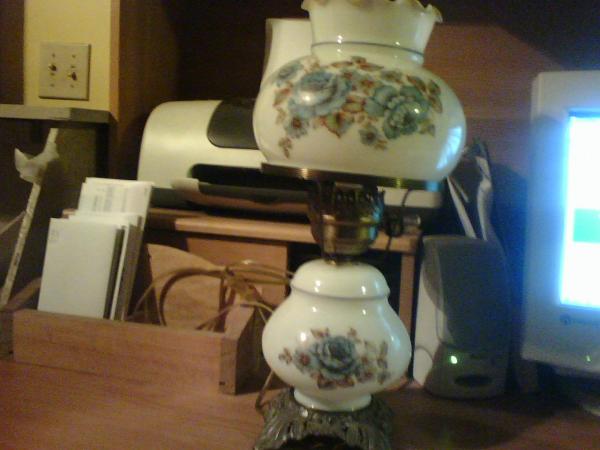 White glass or porcelain blue flowers two large one medium five small on top one large one medium three small on bottom green and brown leaves rippled top small blue stripe around top between flowers and top blue ring around top of bottom, electric, bottom night light. Took picture with phone but computer stupid so will email picture,6 lines on casting bottom of top globe, skeletan key look turn on control