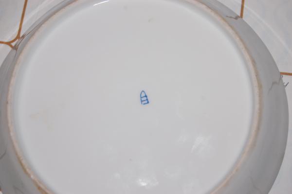 I think this is porcelain, it makes a high pitched swishing when you rub your finger around the rim. The maker mark I think can identify it if anyone has ever seen it before. Pretty distinctive blue mark on the underside-- it looks like a thimble with two lines through it. The plate has a slightly raised rim on the inside and the paint has worn off that part, but on the underside you can feel nothing- not indentation though it's a thin plate.