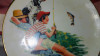 This little plate/bowl is painted with yellow base, black circles and squares and flowers in burgundy green and it is finely trimmed in gold around each flower, but some has worn off.