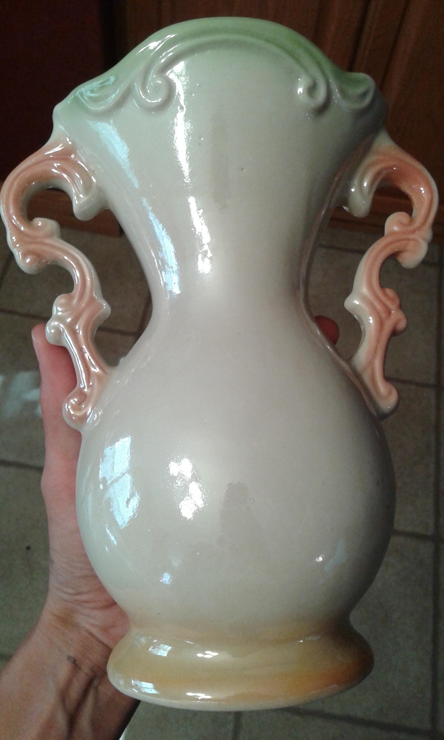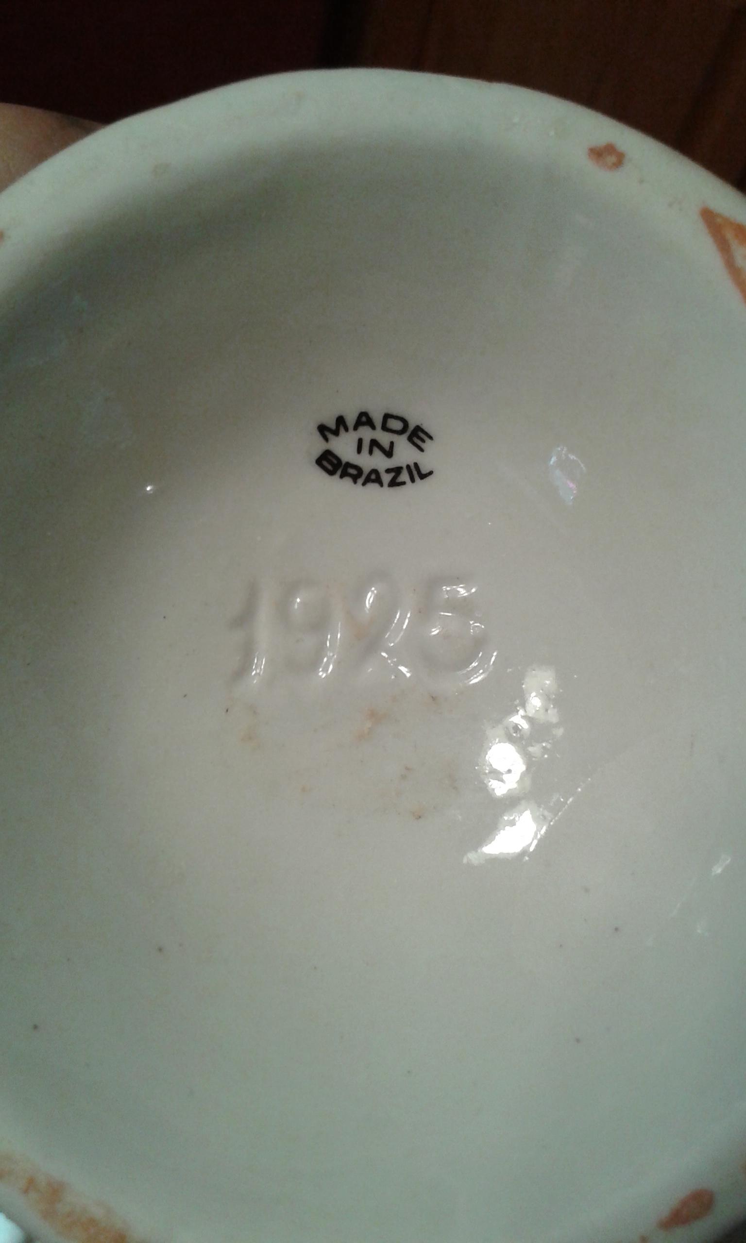 I have a vase. Not sure of what it is made of. It has a handle on either side and flowers on the front. The bottom is stamped Made in Brazil and it has 1925 engraved on the bottom as well.