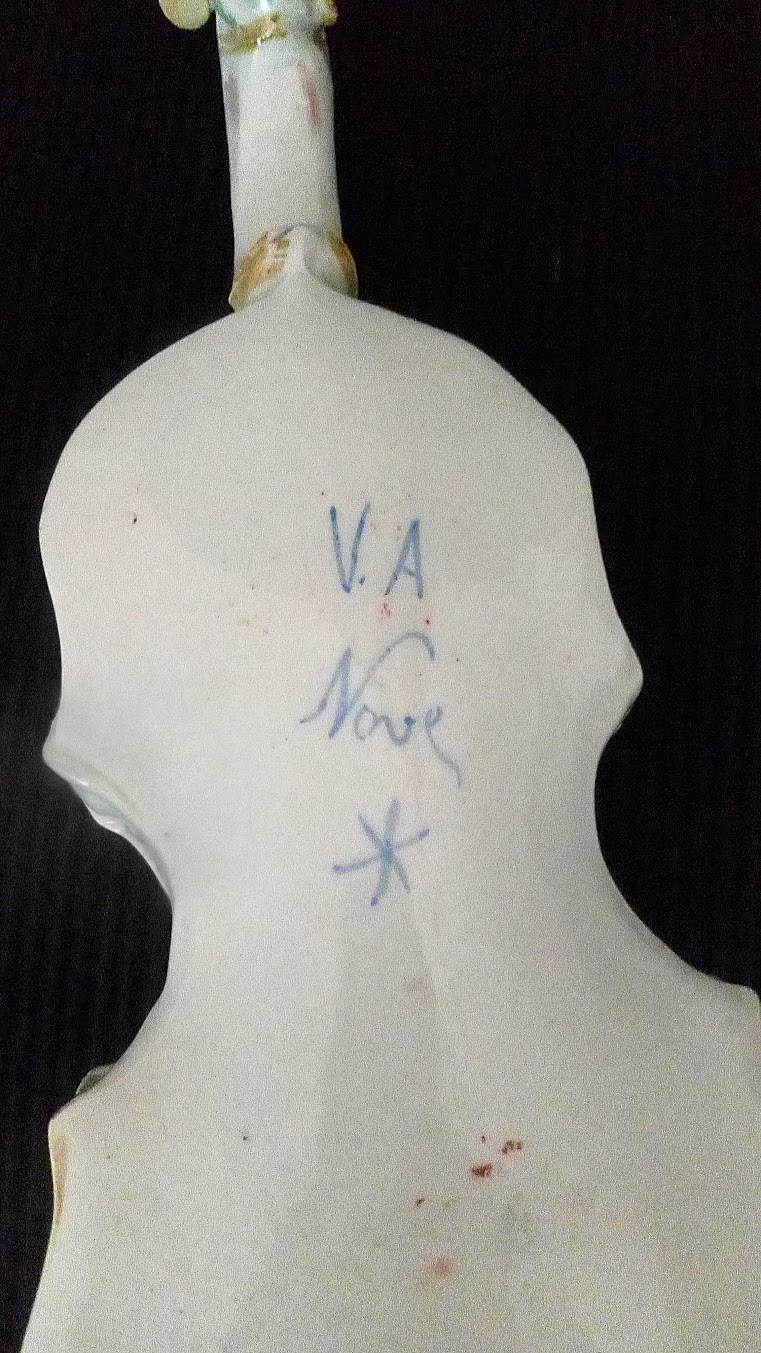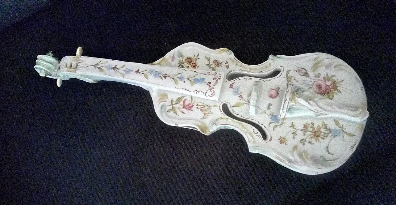 I am trying to identify this porcelain violin which has been in my family for decades. It measures 13.5 x 4.5 x 2 inches. The reverse photo shows the only markings on the piece. If you know anything about it, please let me know. Thanks.