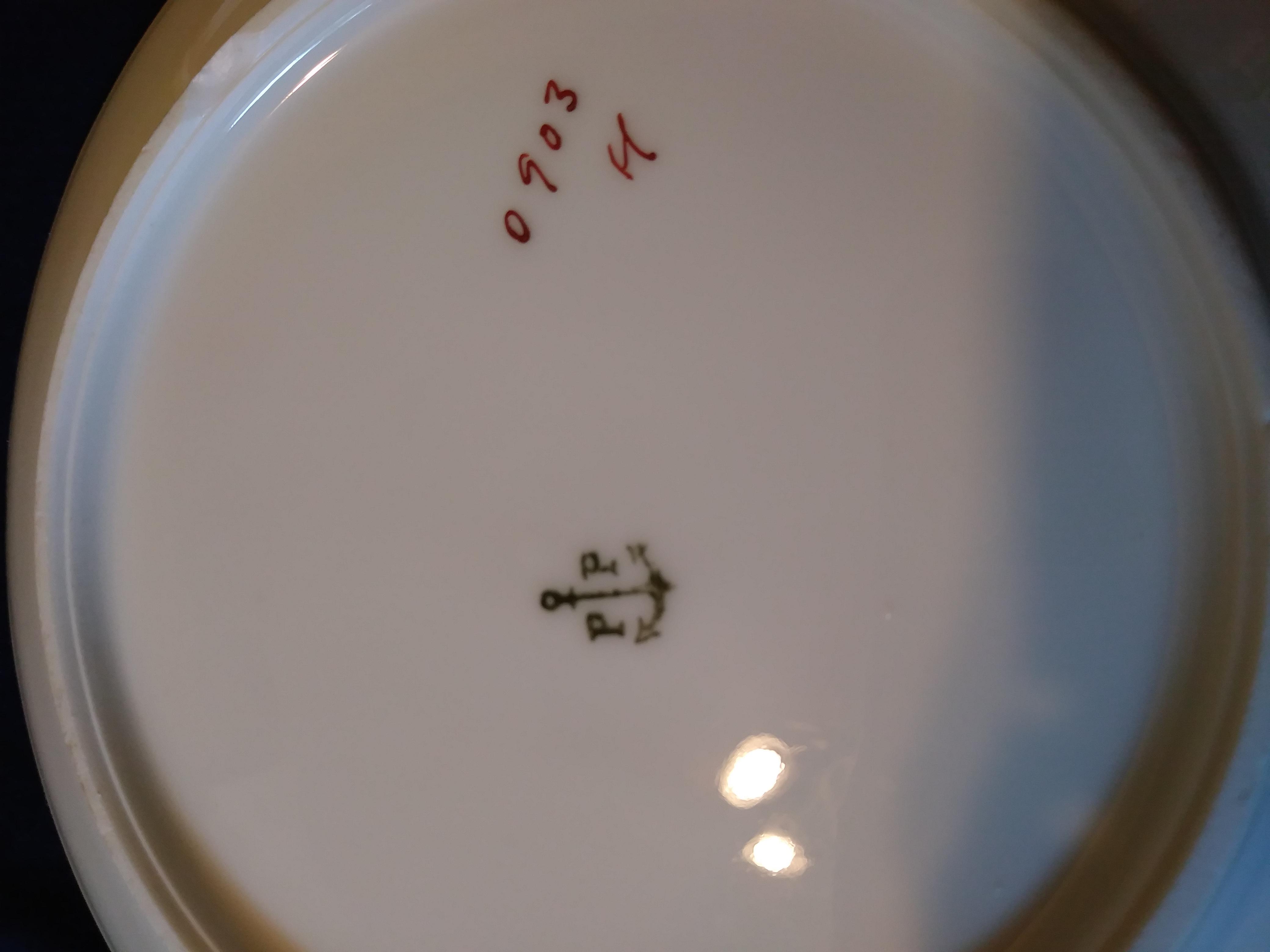 I have a set of 9 dishes with a painted fruit design and gold trim. The edge of the plates have a slight wave design. It is not a smooth circular plate. The backstamp has an anchor with 2 letter "P's". I searched the backstamp and found it to be Porsgrunn or Porsgrund.