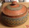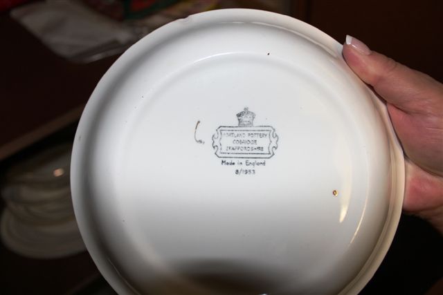 A set of (originally) 12 each of dinner plates, breakfast plates, side plates, desert bowls and porridge bowls. Two sauce bowls with saucers, two large and two small serving platters, serving bowls with lids and one large desert bowl without lid.
