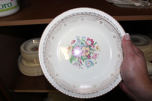 What is left of the set is 10 dinner plates, 9 breakfast plates, 7 side plates, the serving platters, bowls and sauce bowls with lids.