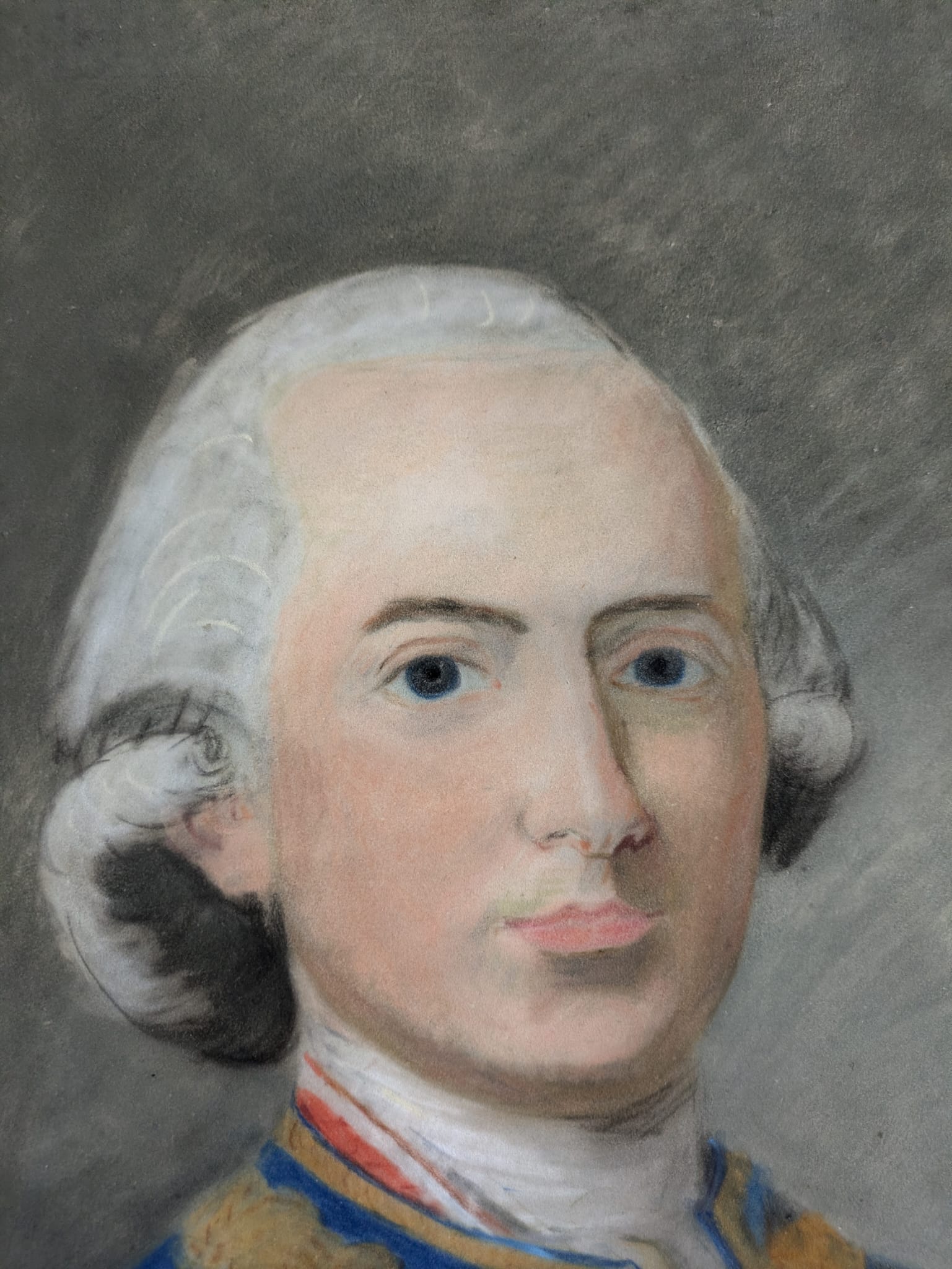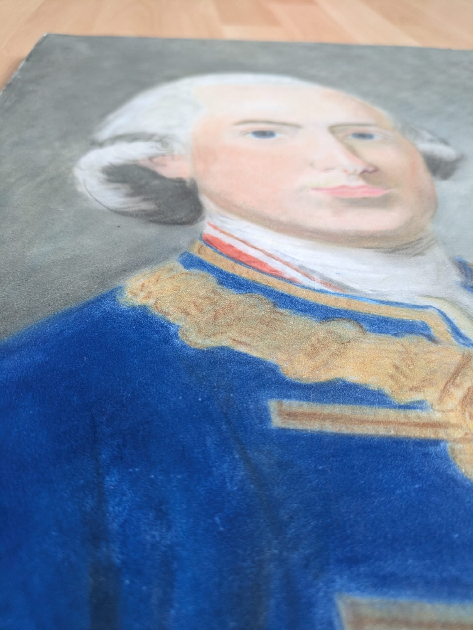 Physical Description: This portrait depicts a gentleman or officer in a blue uniform adorned with decorations. The medium is pastel on paper, originally mounted on a stretcher frame. The dimensions are approximately 48 x 36.5 cm. A visible date of 1772 is inscribed at the edge of the image, indicating the year of creation.
