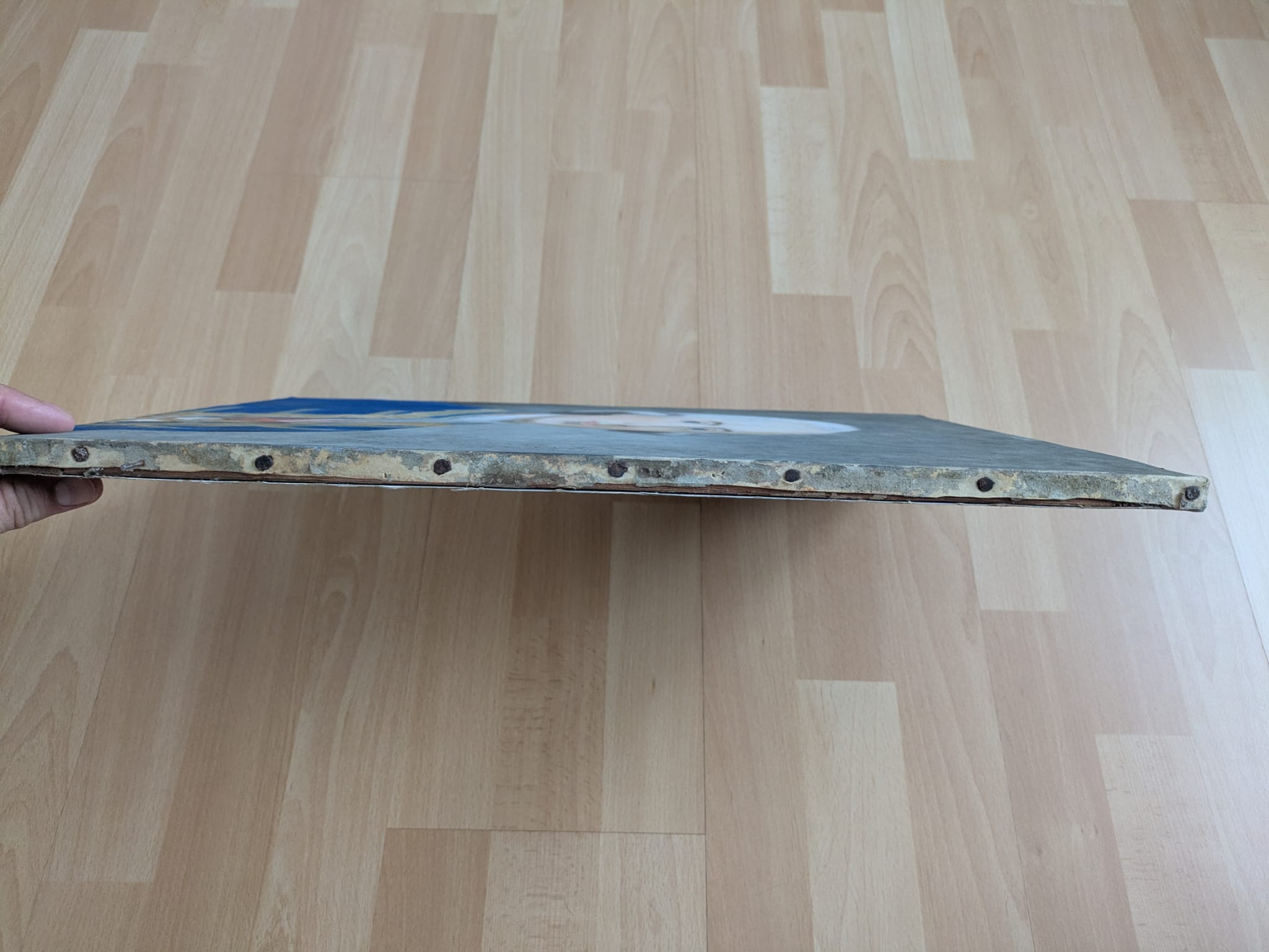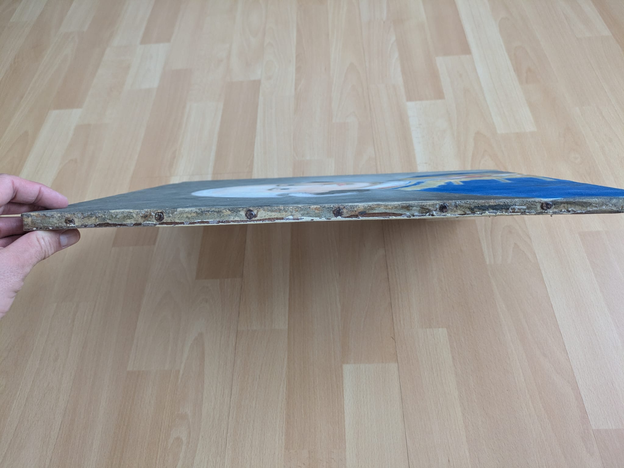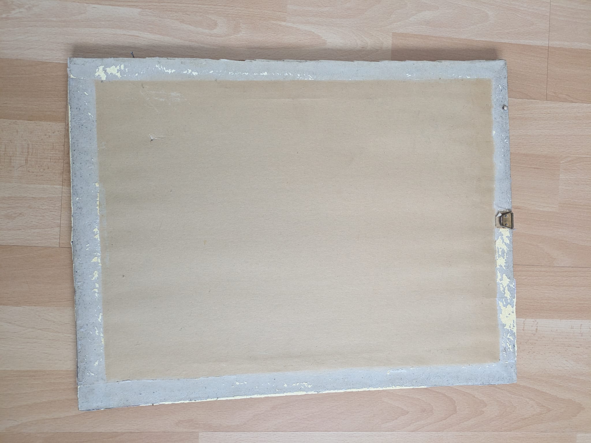 The artwork is complete with no missing parts. The original mounting on a stretcher frame is intact, which adds to its value.