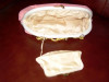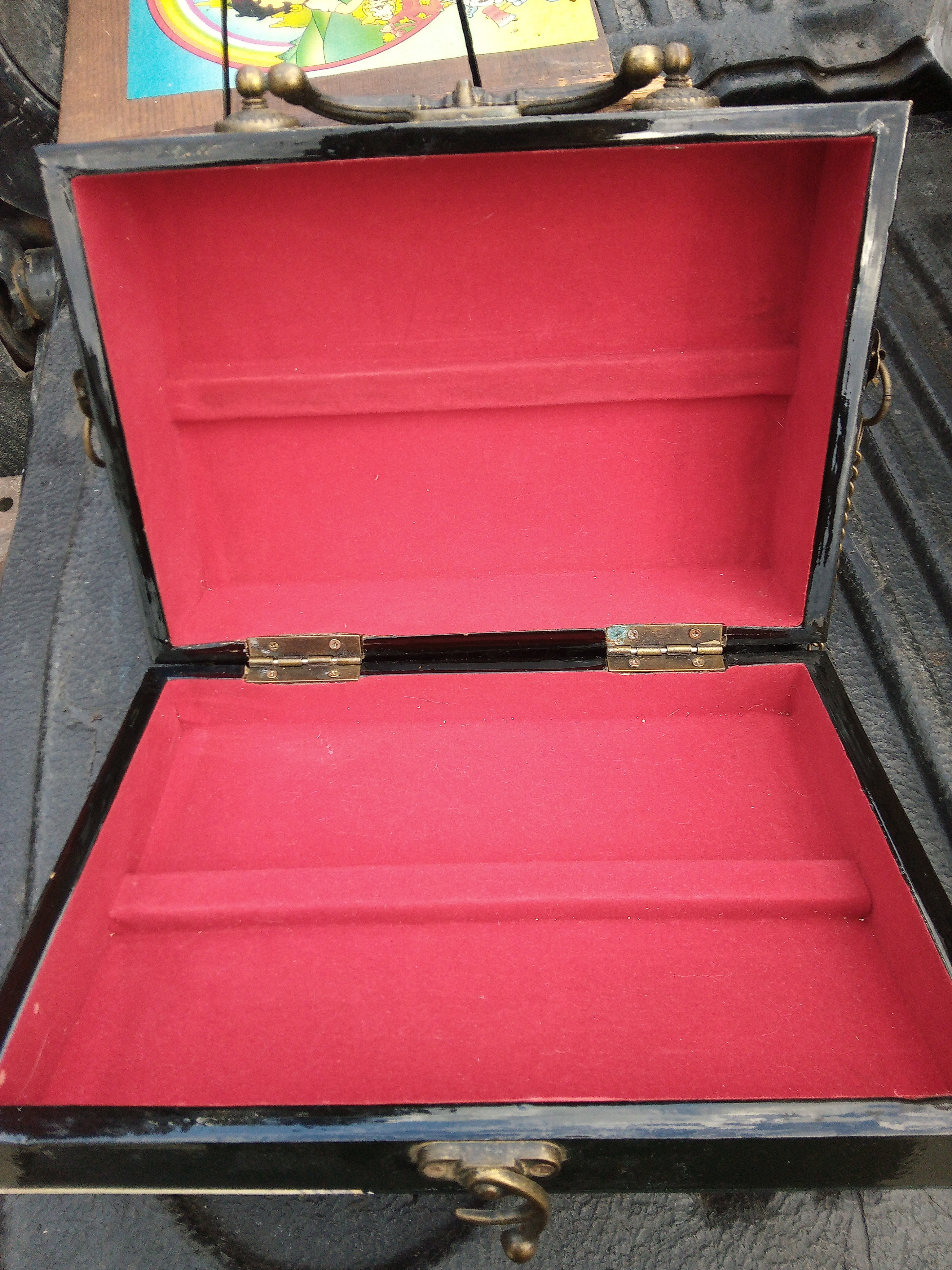Physical Description: This item appears to be a vintage clutch purse, possibly from the early 20th century, featuring a striking image of a woman adorned in jewels on the exterior. The purse is made of a hard material, likely wood or a composite, with a glossy black finish. The interior is lined with vibrant red fabric, providing a stark contrast to the exterior design. It includes a metal frame with a decorative handle and a clasp closure.