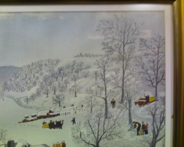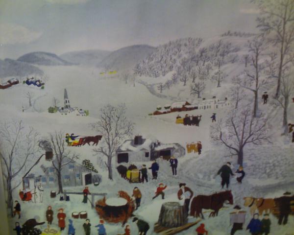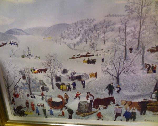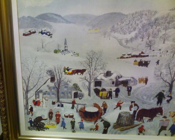 <p>http://huntsville.about.com/library/blmoses.htm</p><p>Here is a photo of the same picture, different frame on January 27, 2002. Her works where at the Huntsville Museum of Art. Huntsville is one of only seven museums in the nation to present this 87-piece exhibit of the most important paintings of Anna Mary Robertson.</p><p>This one is named<em>" Sugaring Off</em>", 1943, It is in a Private collection.Only four images, The Old Oaken Bucket, Sugaring Off, The Old Checkered House and Out for Christmas Trees, were ever issued in editions hand-signed by the artist. In the case of these signed reproductions, the signature, in pen, appears in the margin below the image. </p>