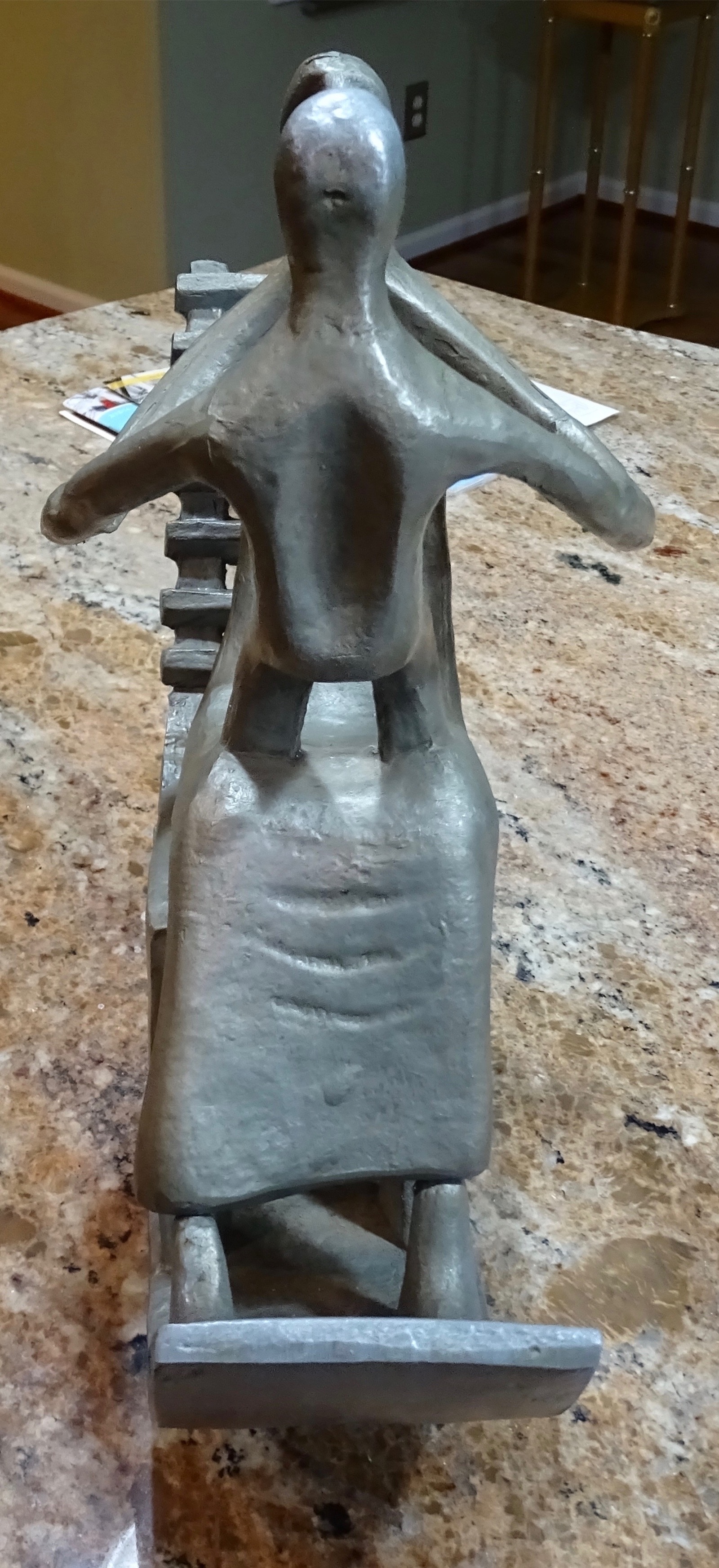 Shown is a sculpture made out of some type of heavy grey metal.  It is a sculpture of a woman rocking a young child.  It is 12 lbs 9.6oz, 15" long, 13" tall.
