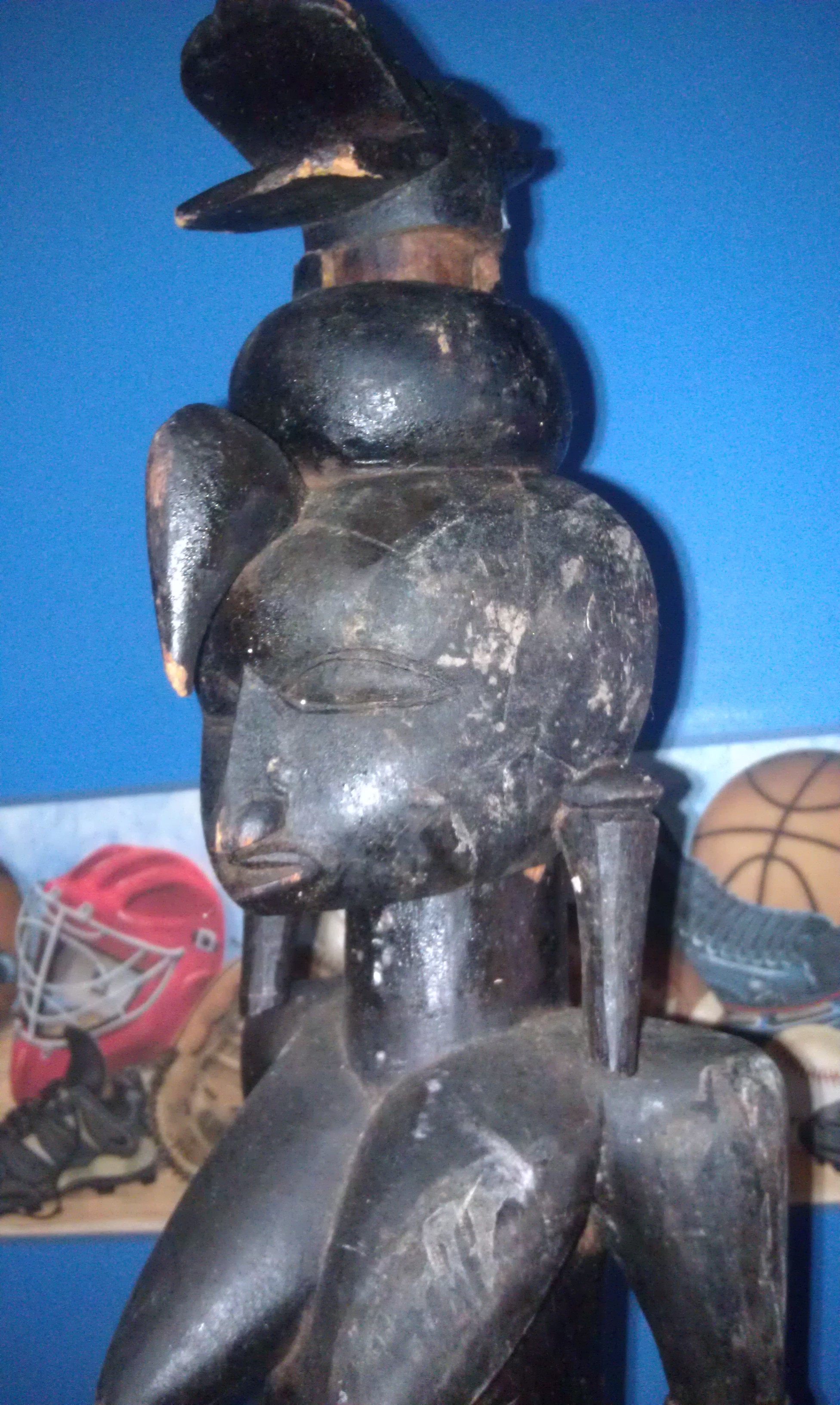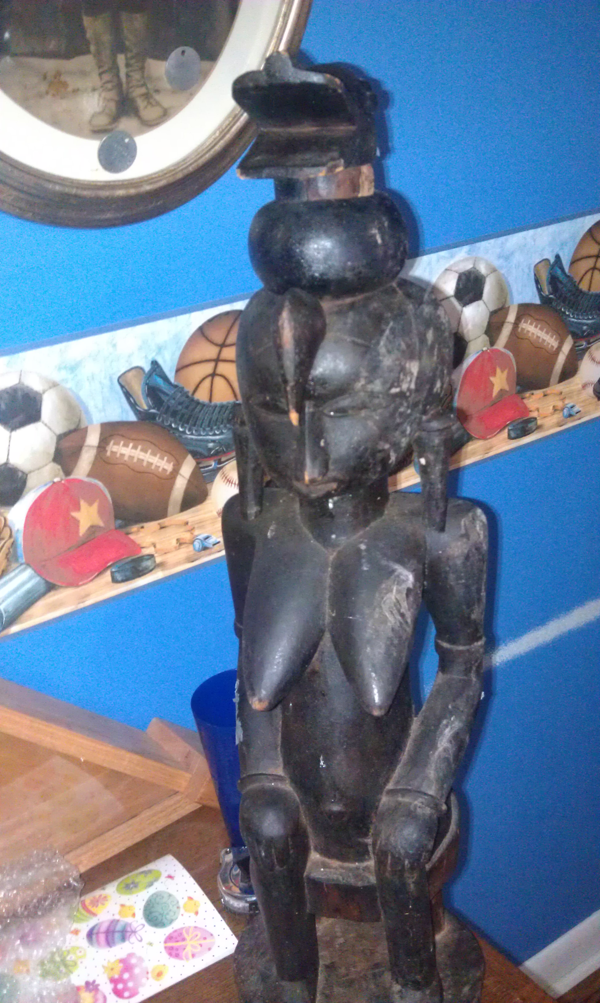 Sculpture of a seated pregnant woman with an opening on top of head with a lid that seems to be of an animal. It has a very old patina but I don't know anything about this piece. There is an inch of the rim of the lid broken off and a piece off of the rear of the neck. Any info would be greatly appreciated. Thank you.