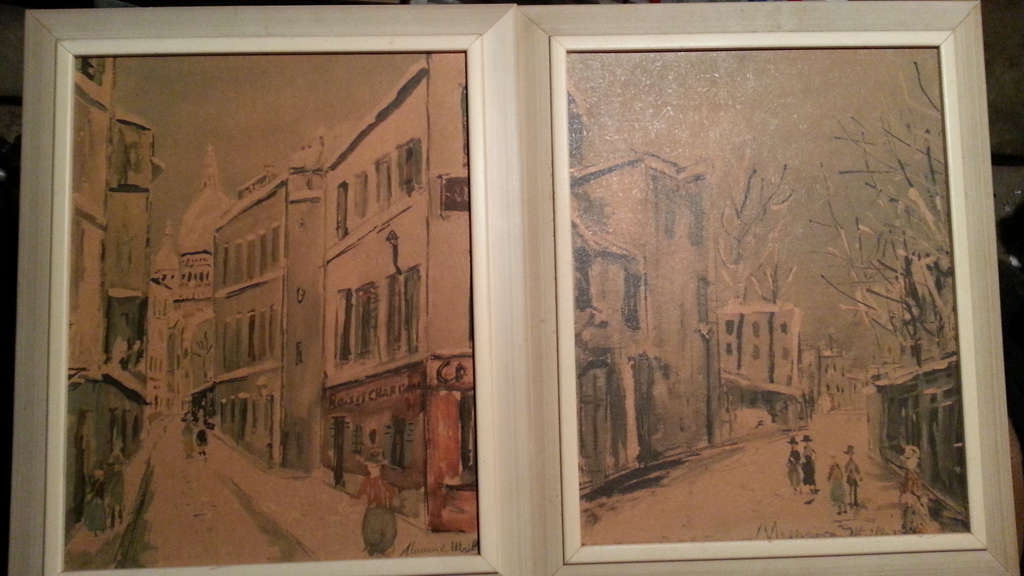 From my grandmother's stories, these were purchased "from the artist himself" in France, years apart in the late 1940's and early 50's. They spent some time in a smokers home and I have no idea on when they were framed. In her 80's, she swore they were authentic and mentioned when buying second work, Utrillo being "older and not so together, look he even signed it with a 5, not a V".