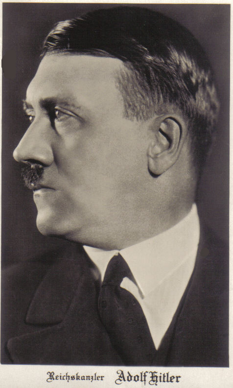 Uncancelled postcard of left profile of Adolph Hitler (head and shoulders). Hitler is wearing jacket, tie and white shirt. He is not in uniform, so I believe it was early in his career (1920's).