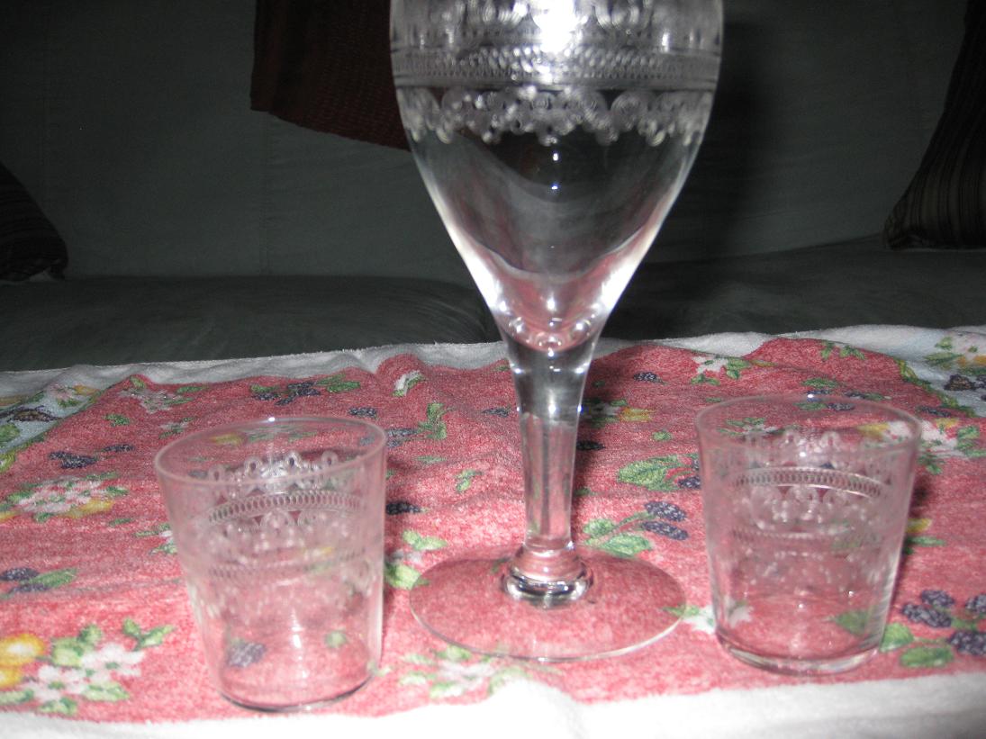 i researched and found them under potomac glassware. i found the goblet but no prices. i also have the shot glasses that match, no info on those. i have 8 goblets and  (1) a little smaller than the reg shot glasses (6)