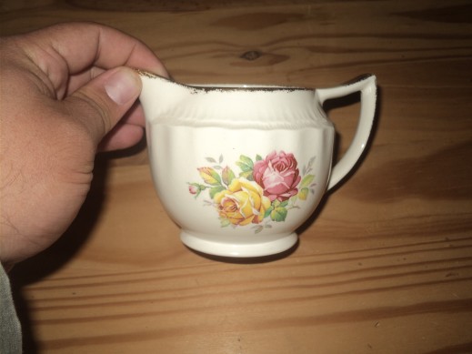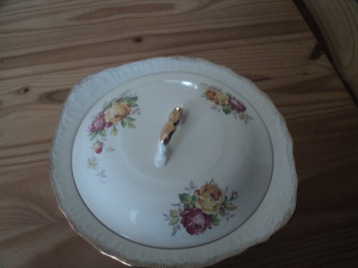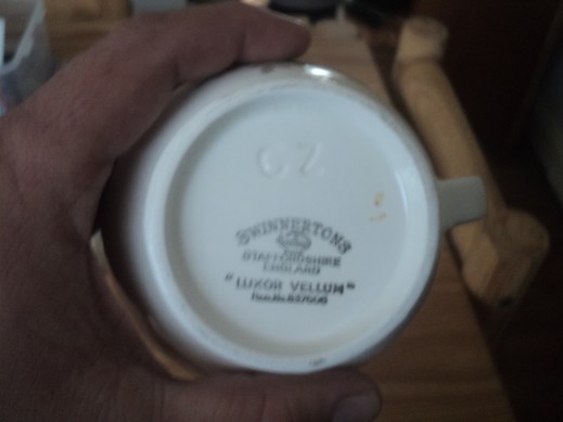in black it say swinnertons staffordshire england reg. no. 837606 and also have a cz int the china above the info it got n pic of two roses on the side one yellow and one red rose gold lining on the edges and handles we have a set of +- 70 pieces.