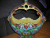 this is a basket made of pottery that is dark brown and the handle is covered with string of some sort and a cover is on the basket of an artistically macreme type design in a string. I do not know its age and there are no markings of any kind on the bowl. It came to me in an auction lot and there were many Baule African masks and so I thought it may be African but I do not know.