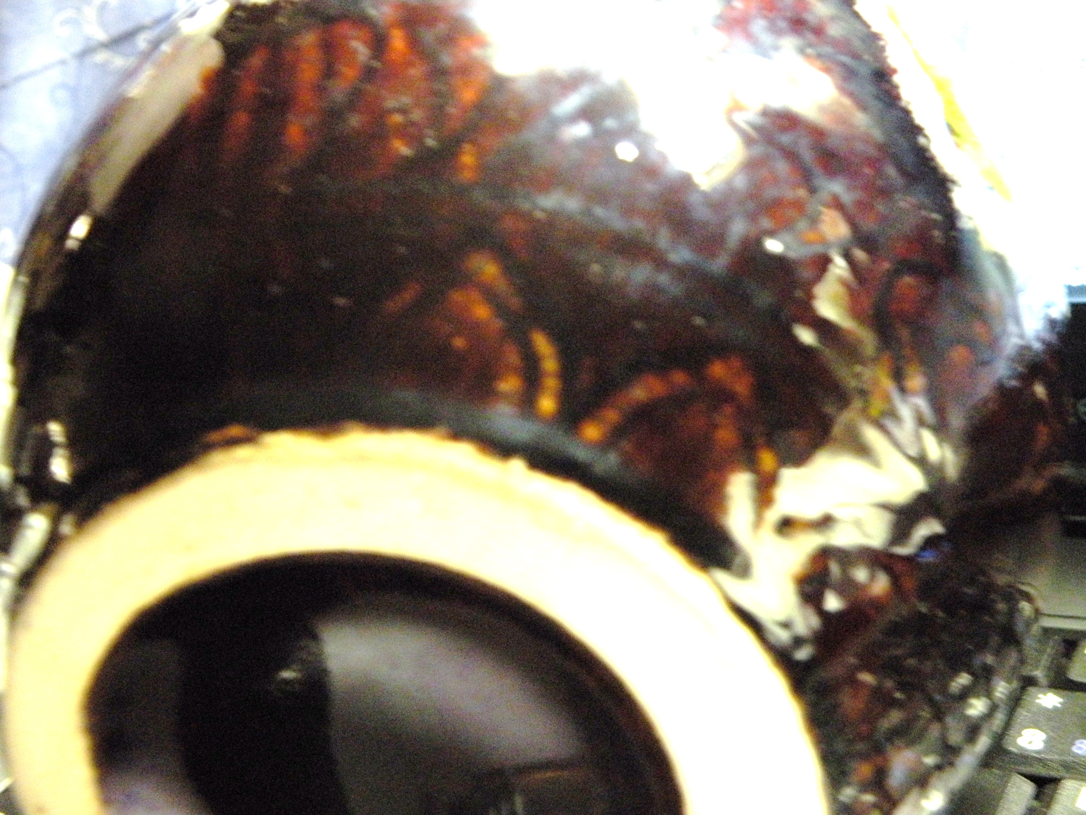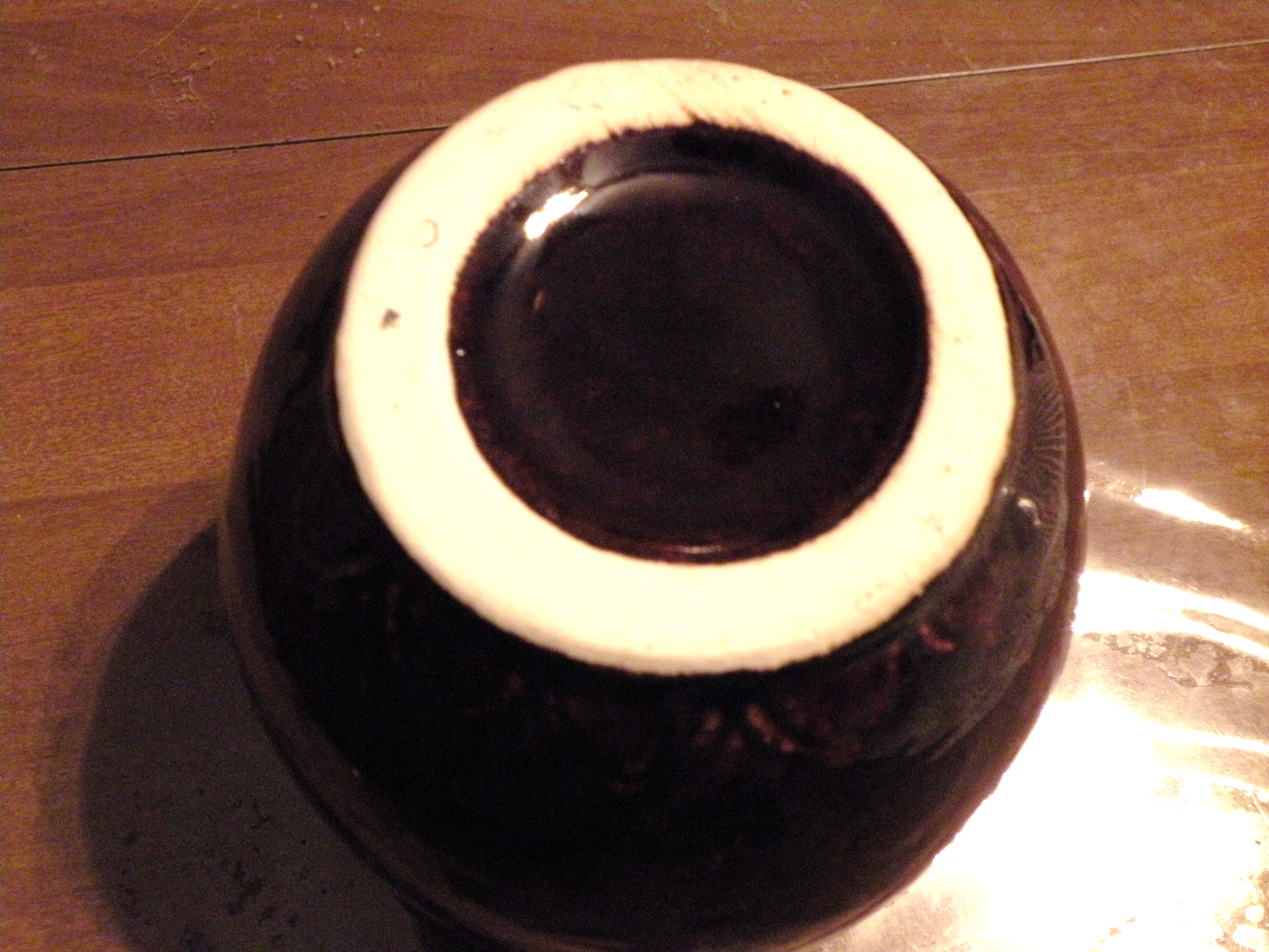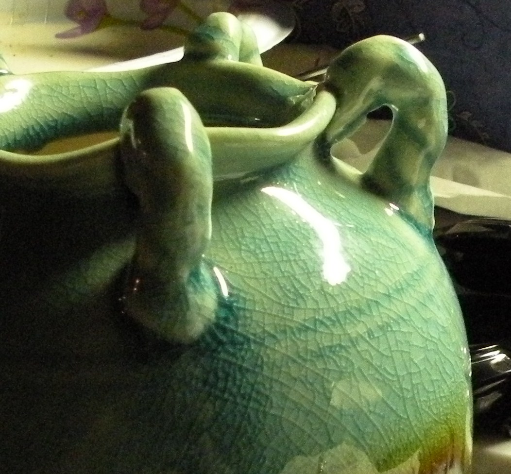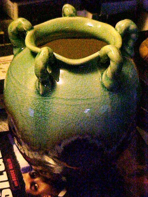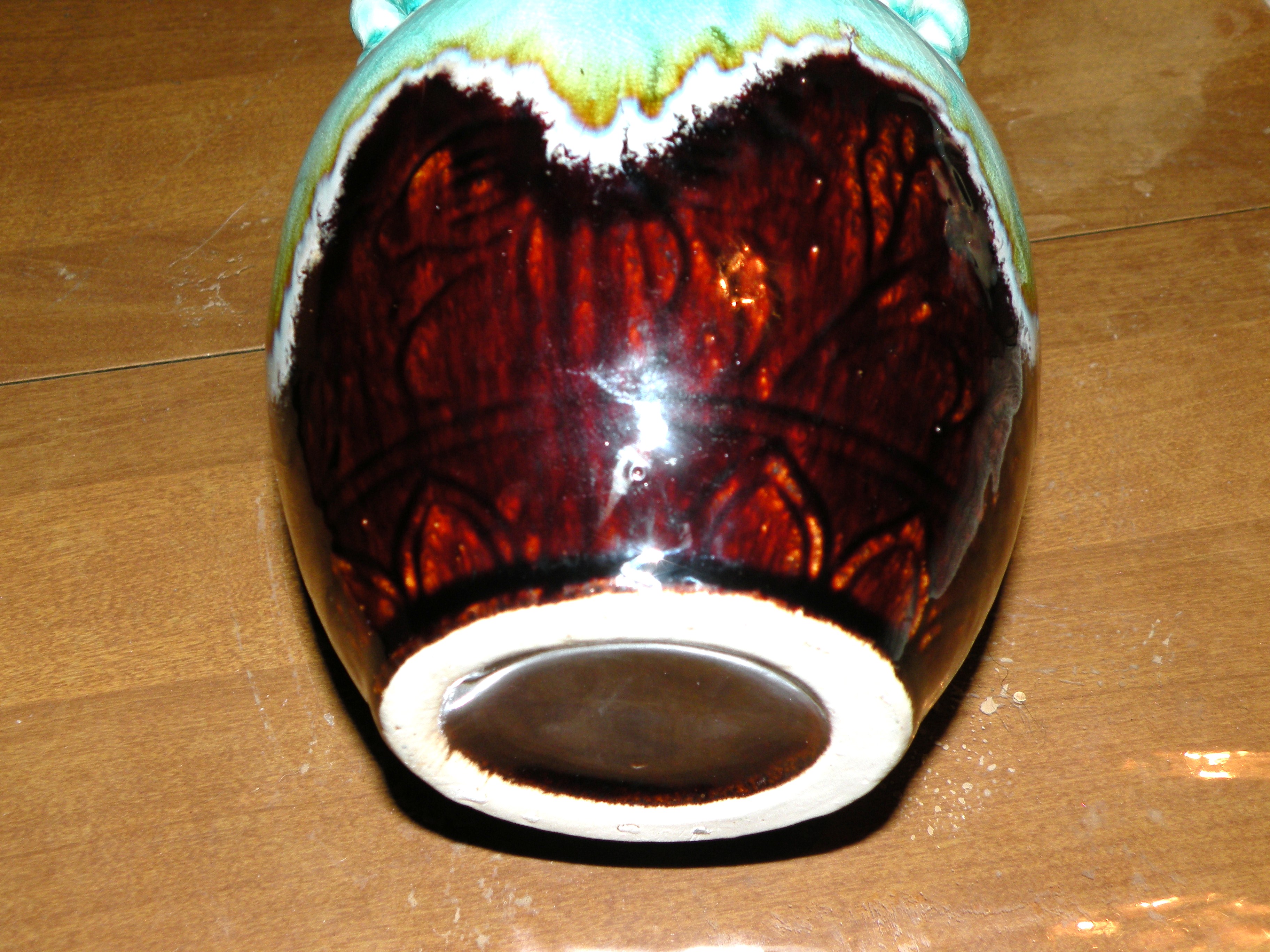 Double A shaps on bottom, line shapes ?flower under brown glaze, 3 drip colors turquoise brown, white, 5 twisted handles at top