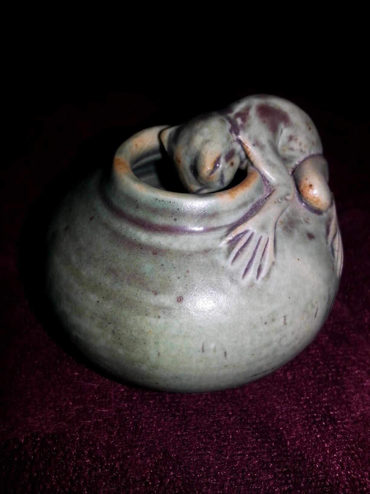 I just purchased a small pottery frog and bowl that I'd like to know more about - no makers marks that I can see.  It is about 2" tall, and 2.5" in diameter.  I'd love to find out more about this little guy if possible!