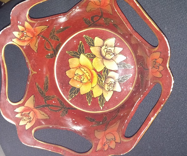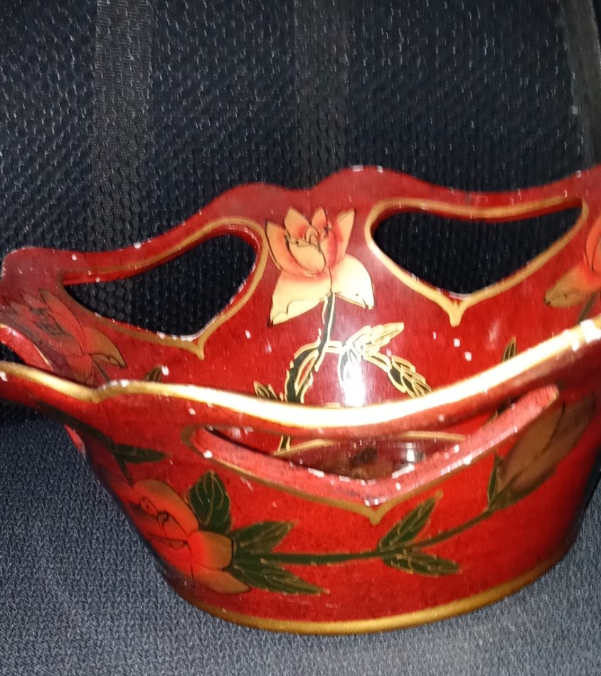 THE CUT OUTS ARE 4 INCHES THERE ARE 6 CUT OUTS. 5.5" DEEP 7" DIAMETER ACROSS BASE 12" DIAMETER ACROSS THE TOP RICH REDS AND GOLD COLORS.. TRYD JUST ANSWER NOONE KNOWS.. THOUGHT SOMEONE HERE WOULD KNO A LIL HISTORY PRICE RANGE ANYTHING.. PICS DO IT NO JUSTICE ITS TRULY BEAUTIFUL THANKS A BUNCH