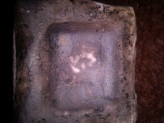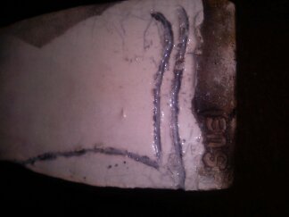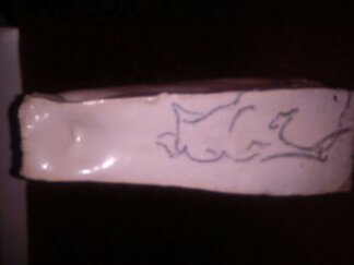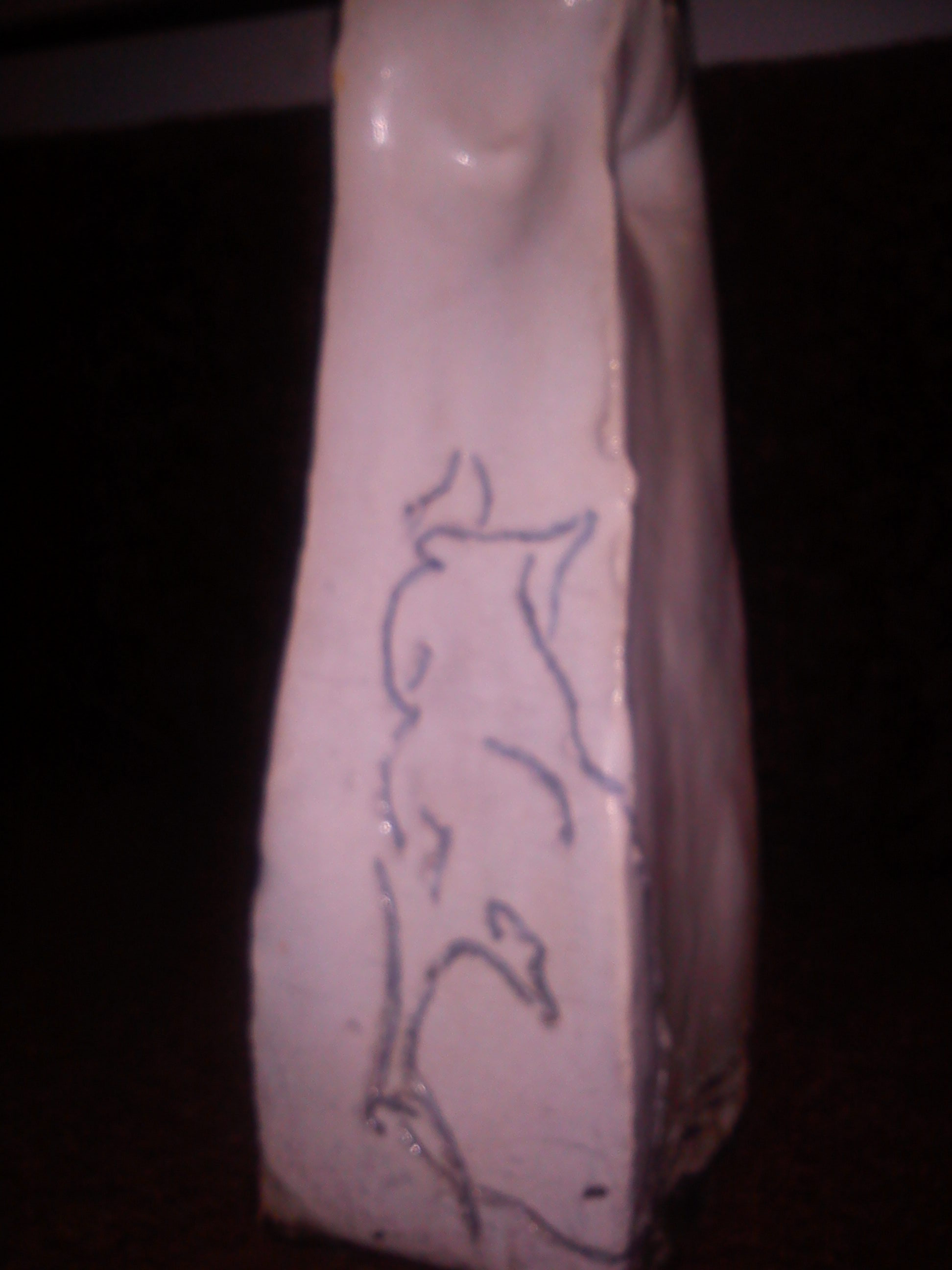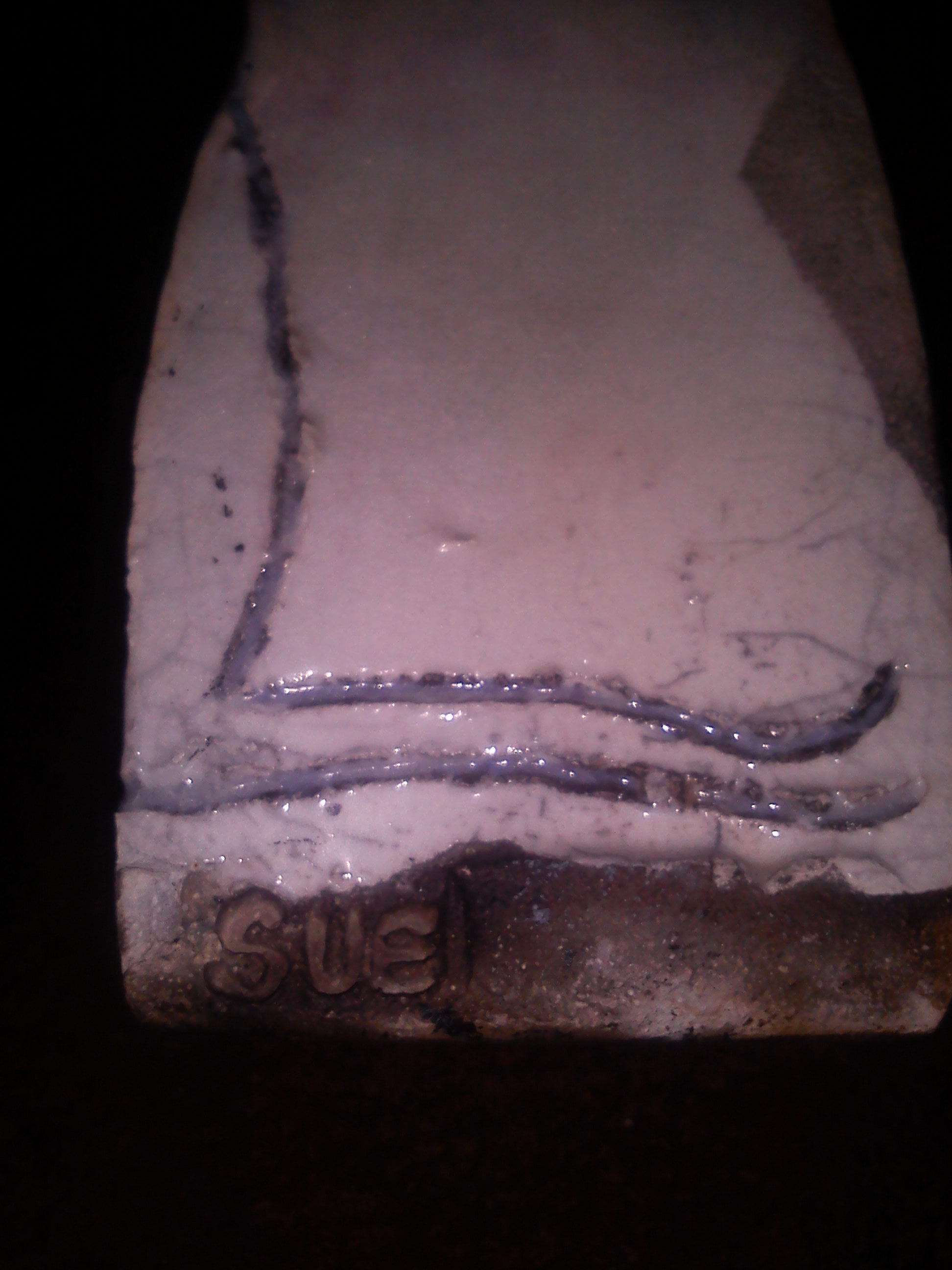 The item is quite old by the look of it, it has the letters SUS impressed on the side, it also has 3 letters on the bottom that i can't make out, the picture on the vase is a drawing of a cat, the pottery i think is stone ware. I also think that there is a mark a box with an x inside but i'm not sure.