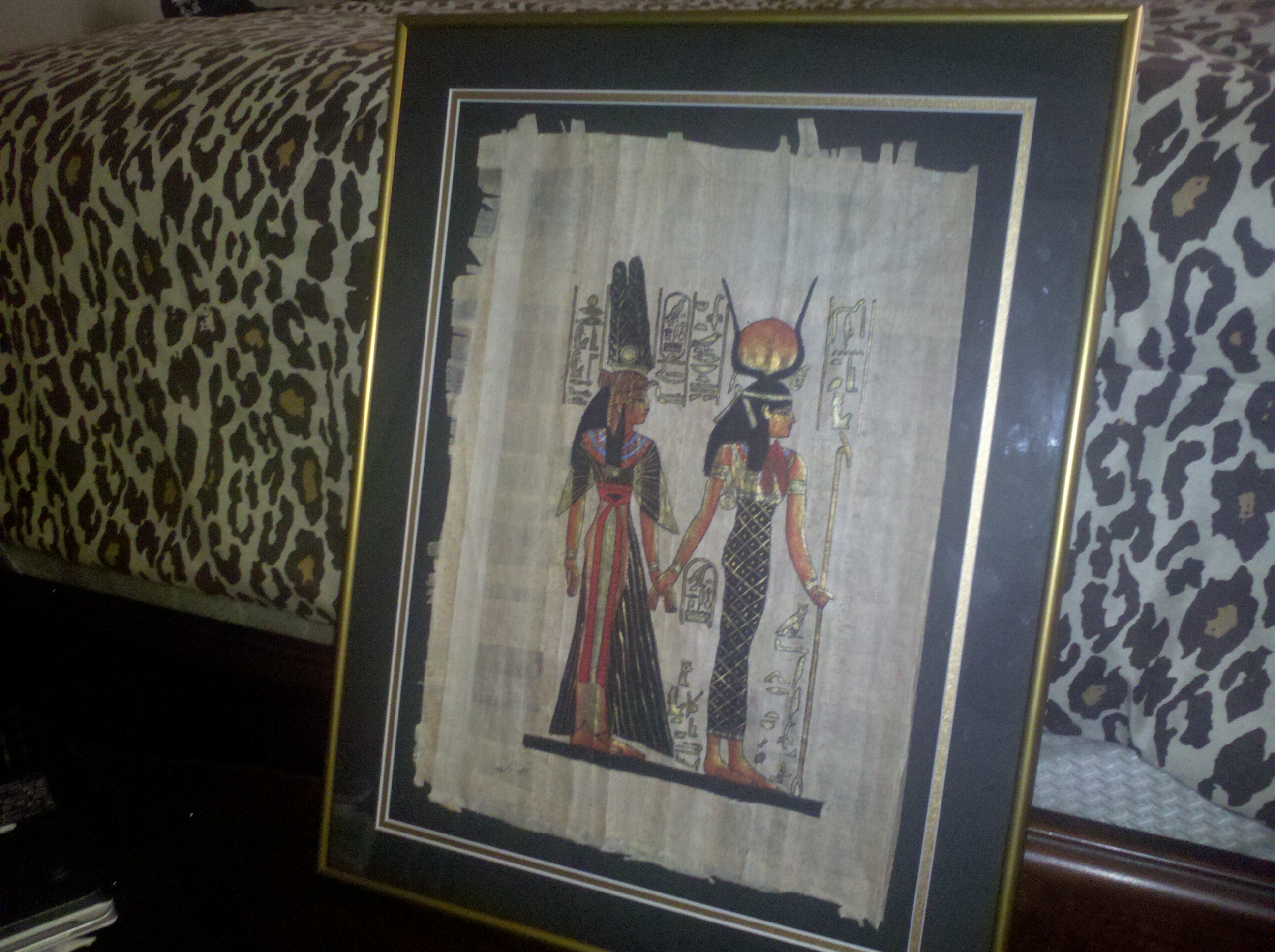 3250 year old scene of Hathor and Nefertari on papyrus paper, signed by an Egyptian artist.