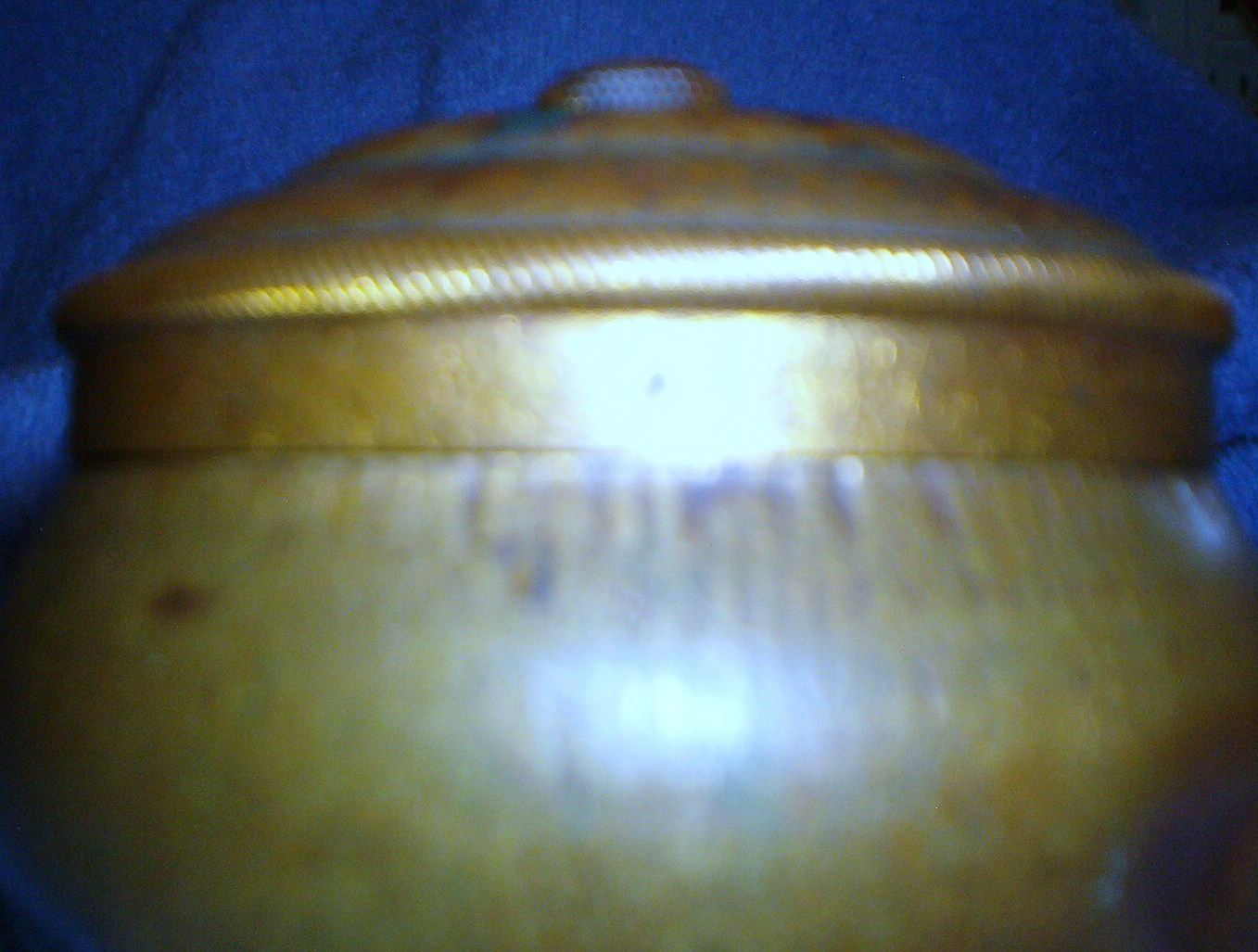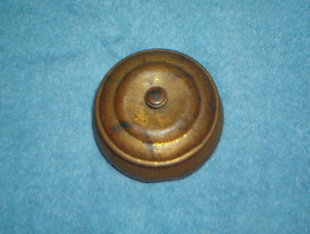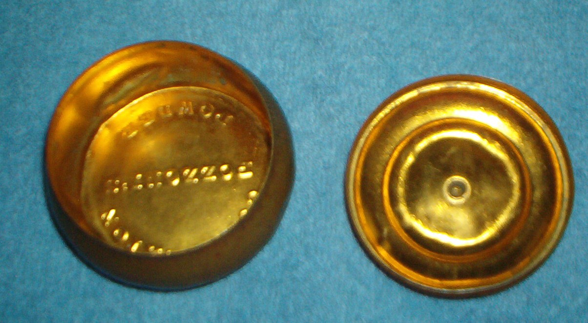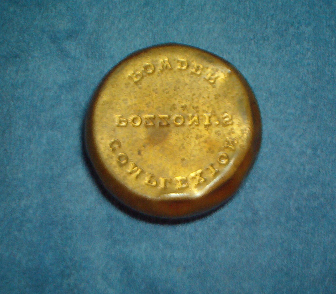 Pozzoni's complexion powder brass container, the gold puff box. It is a small brass round lidded container measures 2.25 inches tall with lid, app. 1.5 inches without lid and app. 3 inches wide. It has a beautiful gold looking finish with a lovely design on the box. It is embossed on the bottom with the words " POZZONI'S COMPLEXION POWDER". This is the container that Scoville designed in 1894 and sold $50,000 worth to the company after a little smarts on his part. The company was using a wooden box. There are a few indentions on the bottom, but I believe they are suppose to be here, they are around the bottom of the outside of the container and seems to be placed there. My container is old and needs to be cleaned up, but I don't know if I should. I cannot find anything anywhere on this container, I did find information on the 1912 container, but it is not this one.
