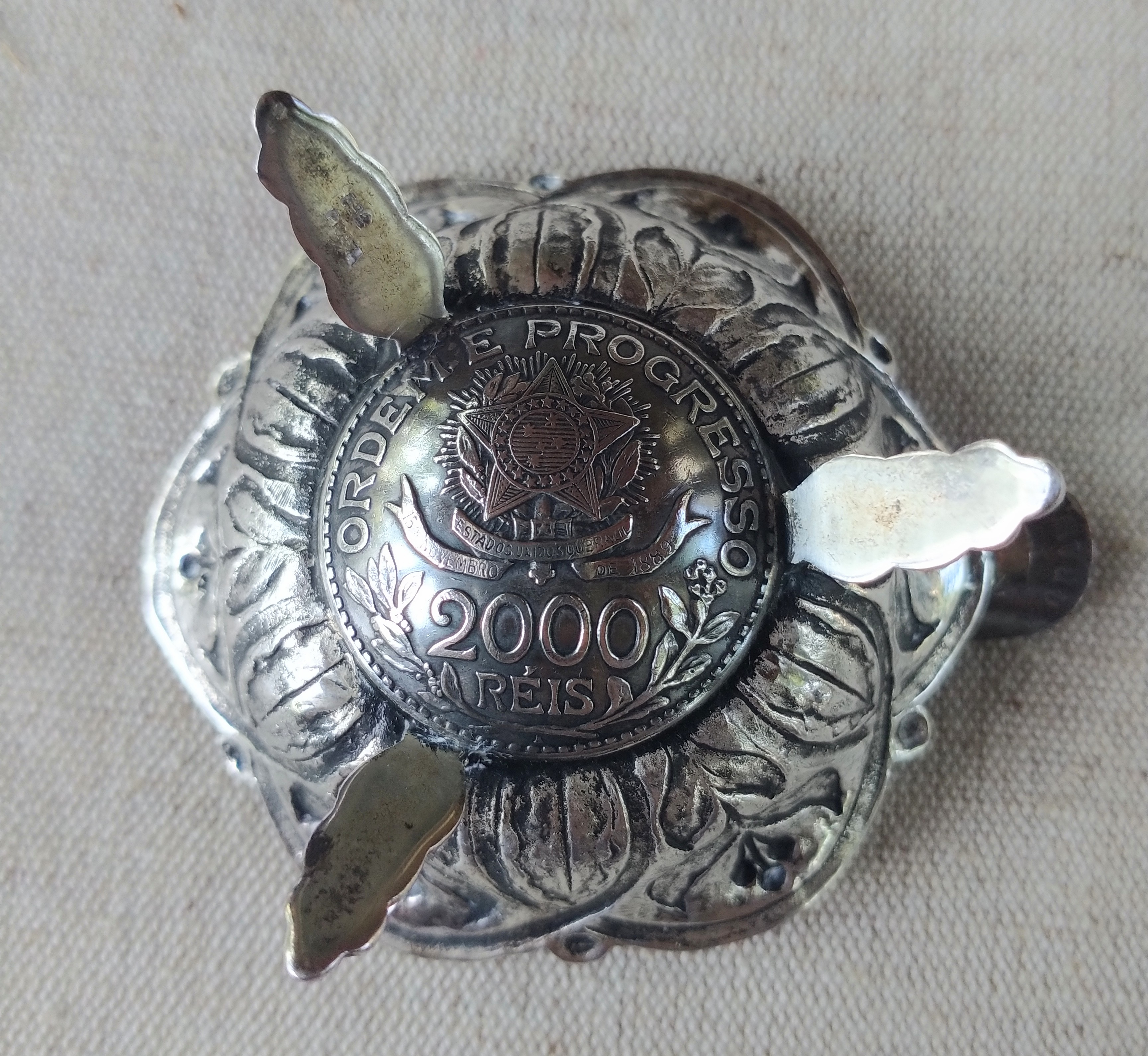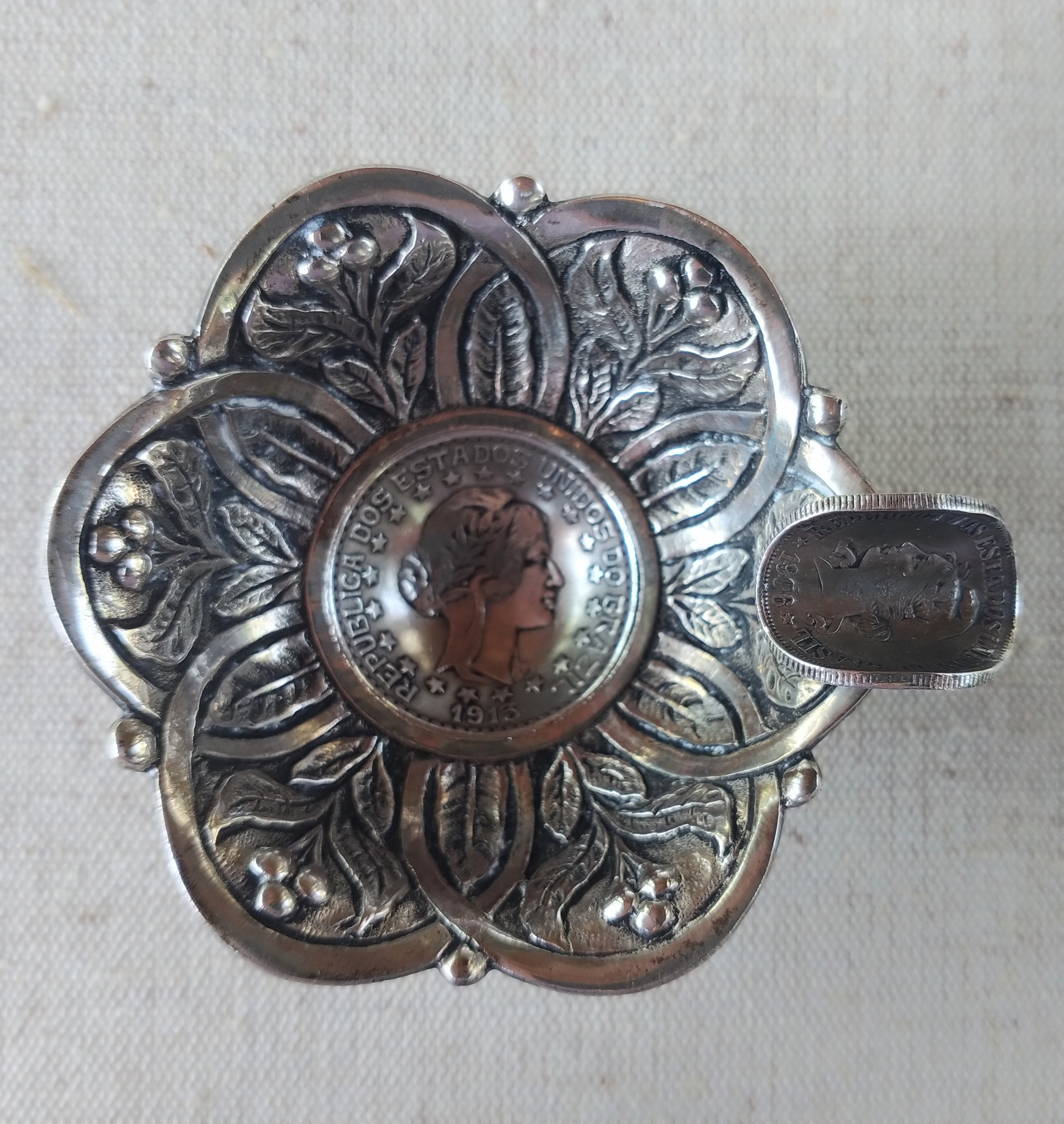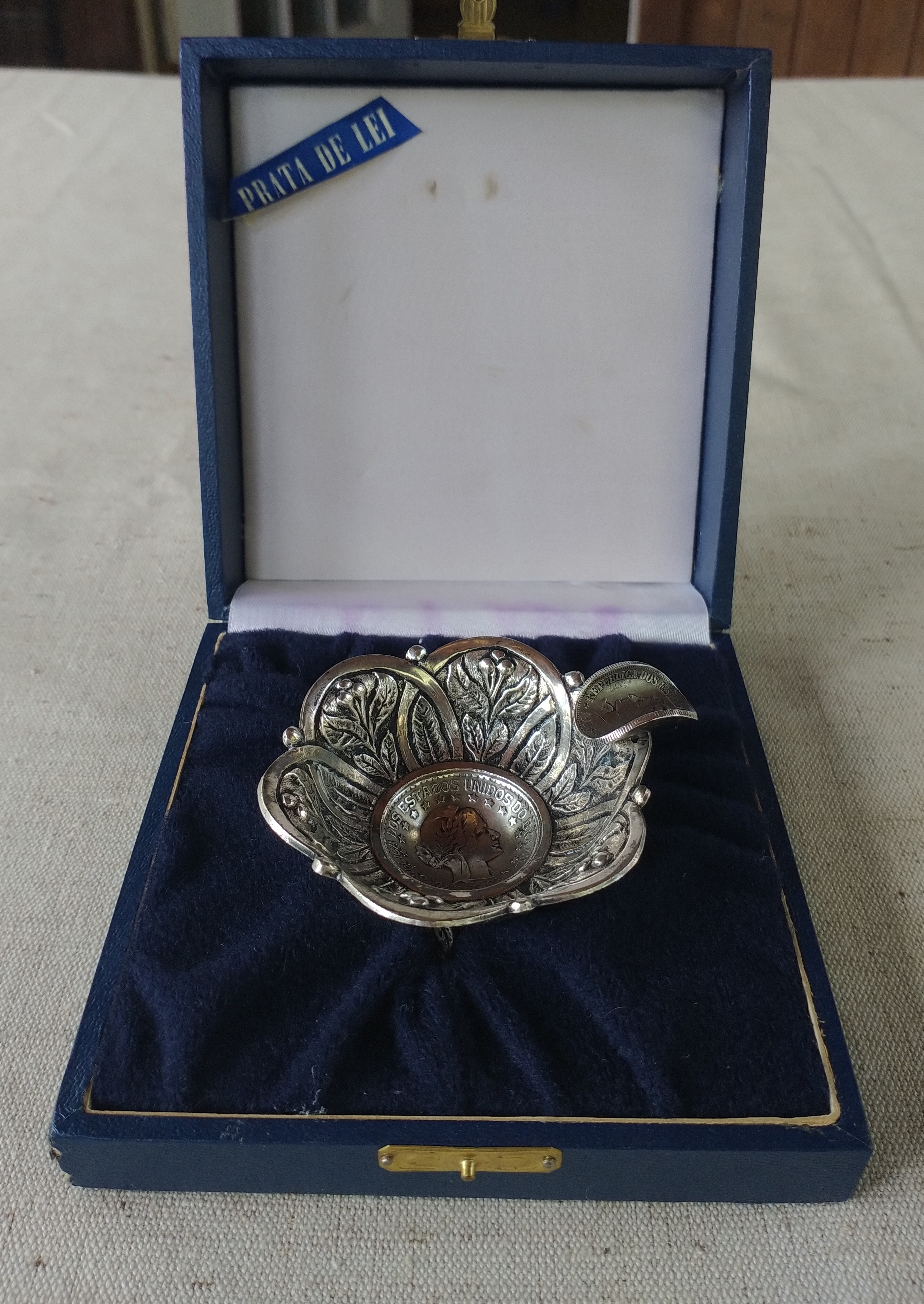 Prata de Lei silver ashtray in presentation case. Coin dated 1913