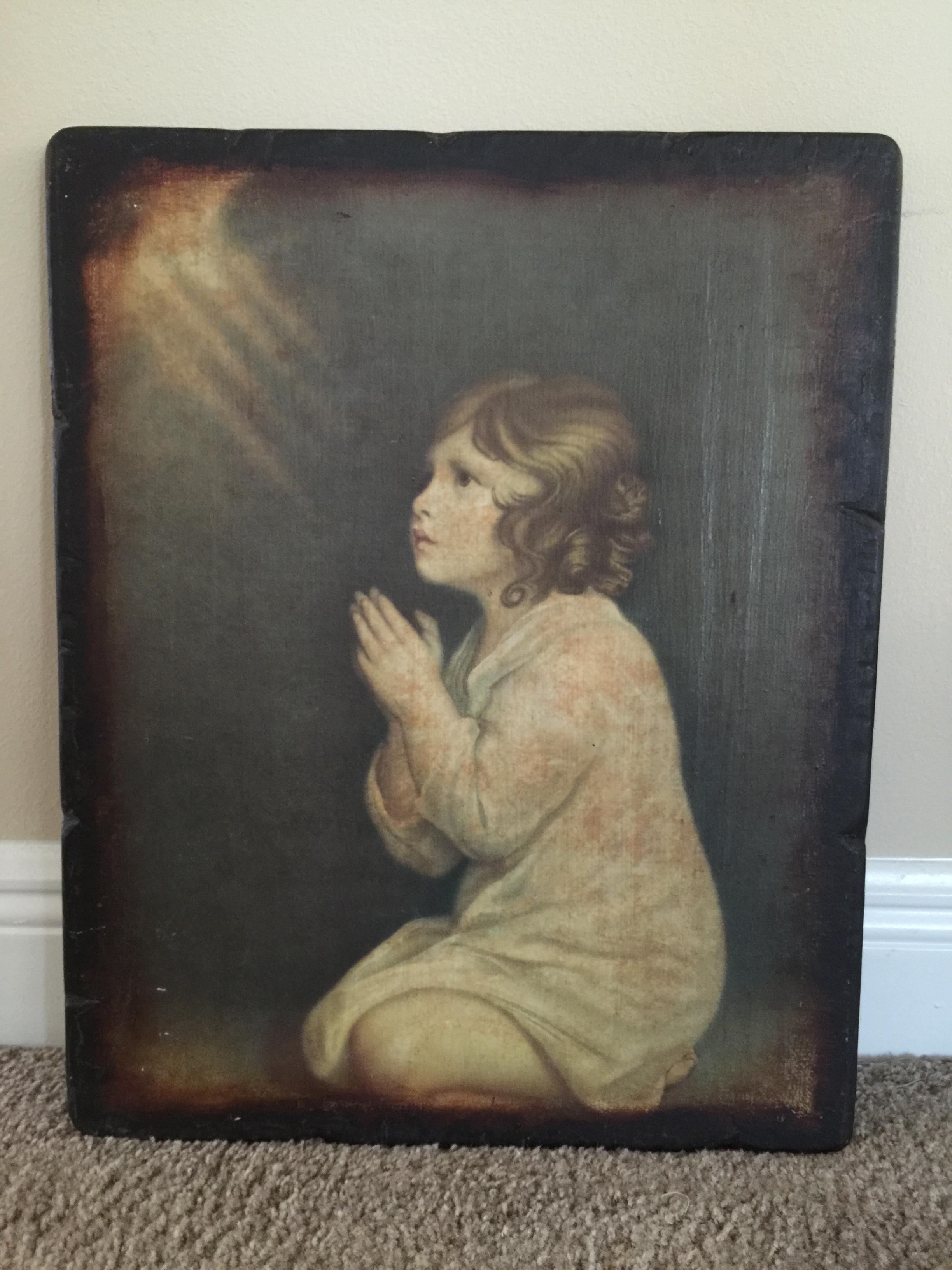 Hello, I have purchased a art piece  from an thrift store that seems really high quality and pretty antique. I am not sure if it is an original or a lithograph as it is on wooden canvas and seem to be one with it. I thought it to be an original but then found another framed version online that was sold . I couldn't find any info on that except that it seemed to be an antique high quality framed lithograph. The piece looks really old, it is an image of a praying little girl. Any ideas as to the author, time period and value of it would be appreciated. Thank you!