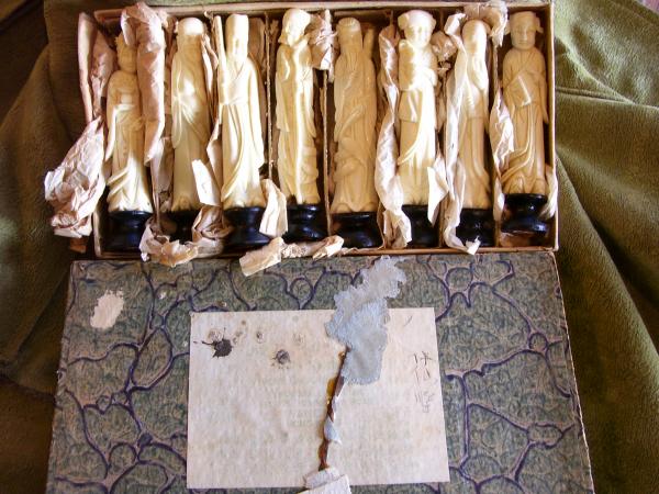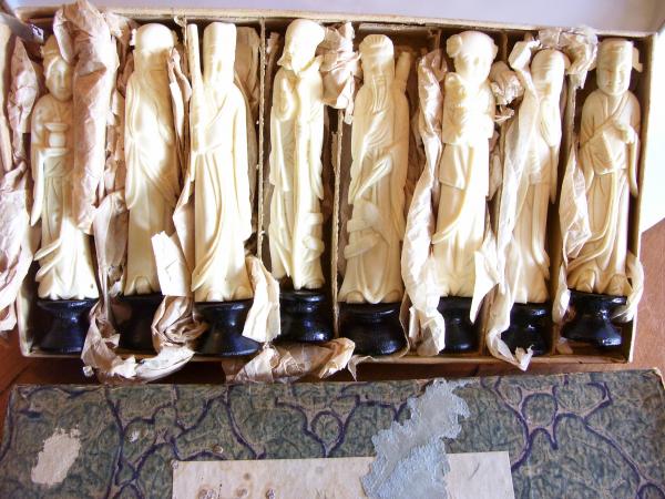 this is a set of 1930's (I think) pre ban ivory figurines, the eight immortals. i have tested using the hot pin test and it is positive. also has lovely grain and crosshatch. box (in bad repair) says "HIP SHIN IVORY AMBERS WHOLESALE RETAIL NO. 175 HENNESSY ROAD WANCHAI HONG KONG" WITH MUCH OTHER CHINESE WRITING.
