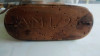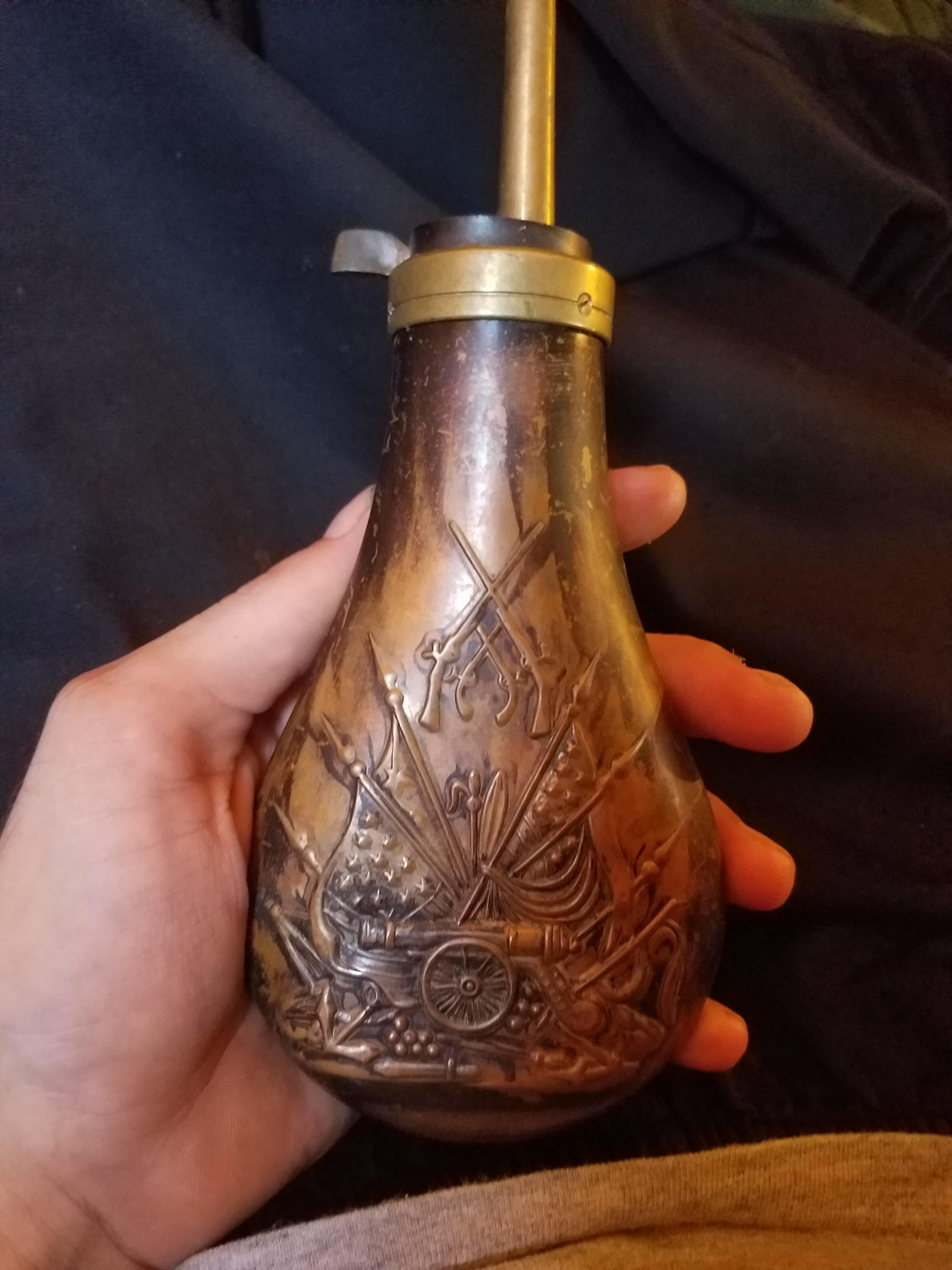 Vintage pre civil war powder horn made of bronze with a cannon flags etc from the civil war era