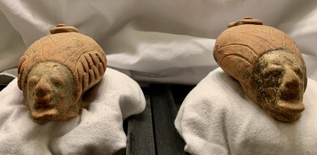 Two sculpture heads that are either from the Chorrera or Jama-Coaque culture. These were given to me as a gift outside the city of Santo Domingo de los Colorados in Ecuador, where I served as a Peace Corps volunteer from 2001-2003. My estimate bases on research is the date between 500 BC - 500 AD.