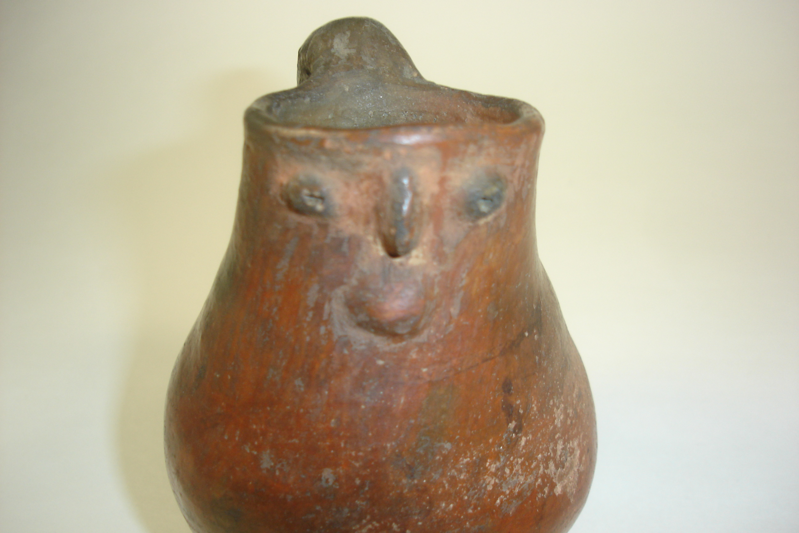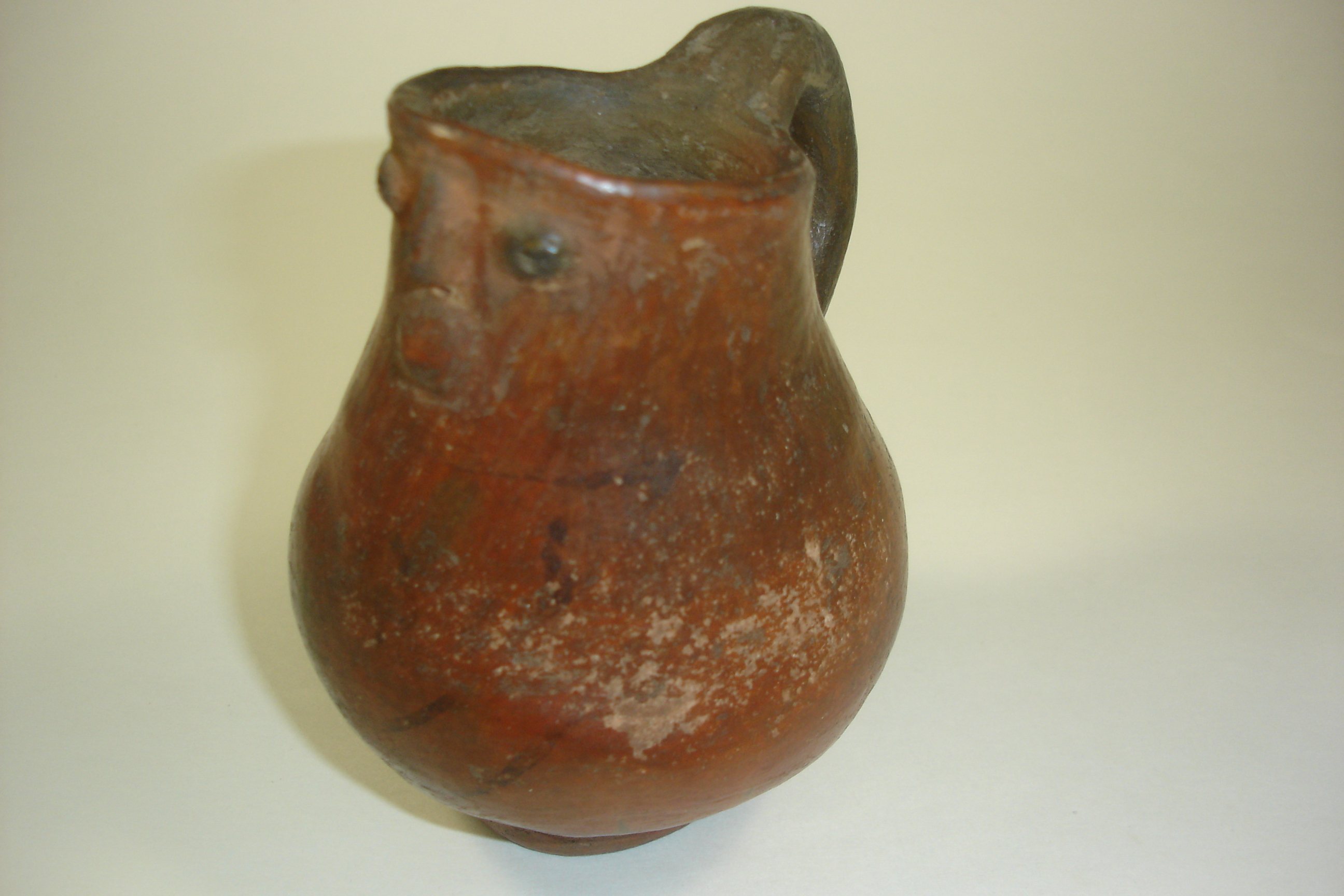 This piece is made of a clay and in the form of an EFFIGY which shows a face on the front of the Pitcher. It measures 4 3/4" high. It is either Native American Indian made or Pre-Columbian from South America as far as I can tell. The person I acquired it from did not know what it was either. It does show hand painted black geometric designs on the body of the Vessel. This is all I know about the piece.