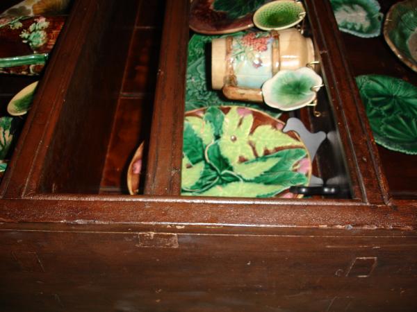The cornice is original with some damage, but wholly intact. Time in the barn has rotted out the bottom shelf of the cupboard. I have not tried to repair this as I wanted the cupboard to remain in 'as found' condition. I have owned this piece for 30 years. As far as I know it has either original pulls on the doors or pulls that date to the early 1800s.