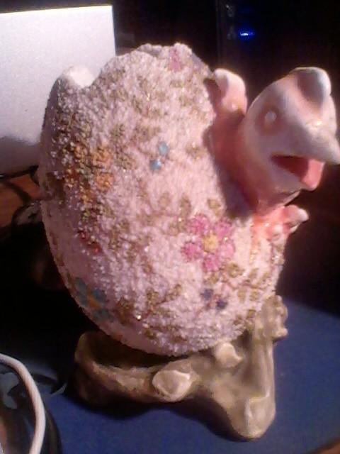 This vase/vessell is 6 inches in height. It is a chicken coming out of an egg. The egg is embellished with what appears to be tiny glass beads. Inside of the vessell was a very old piece of paper that was handwritten and said Schultz Mark Fayence 19th Century. This piece is sort of prehistoric looking but it is also intruiging. I would love to find out more information about this. Thank you