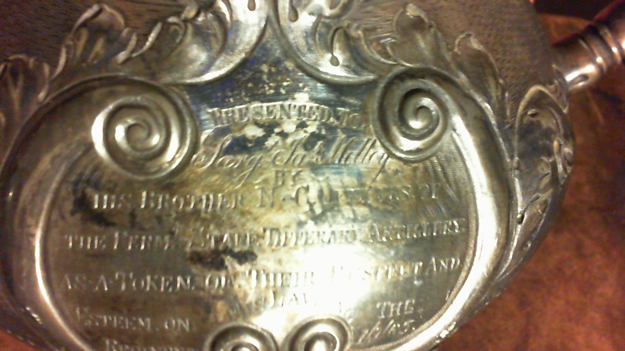 Inscription on front reads: Presented To Sarg. Jas. Malloy by his Brothers N.C. Officers of the Perm. Staff Tipperary Artillery as a token of their respect and esteem upon his laveing (miss spell apparently) the regiment 1/9/65.