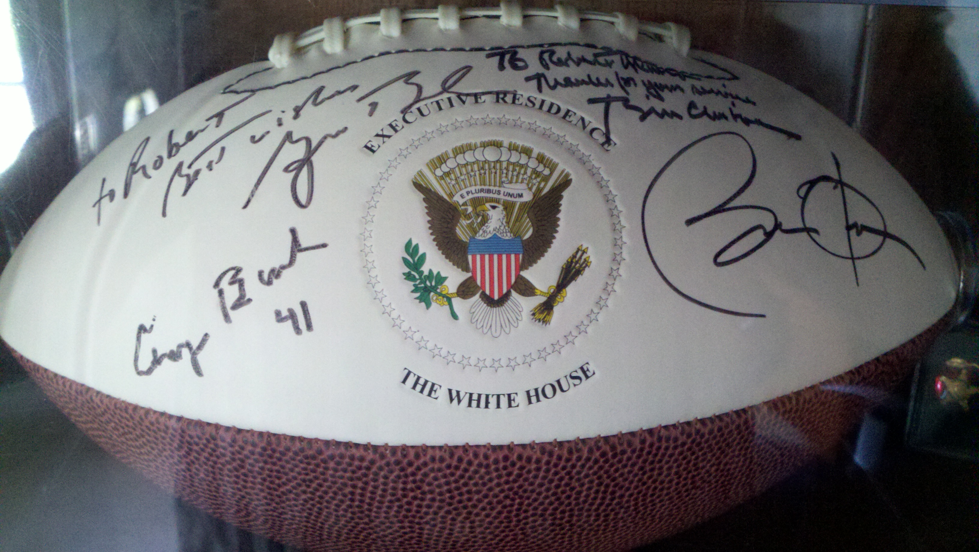One Presidential football with seal on ball. Signatures of Presidents Clinton, bothe Bushes and Obama.