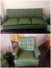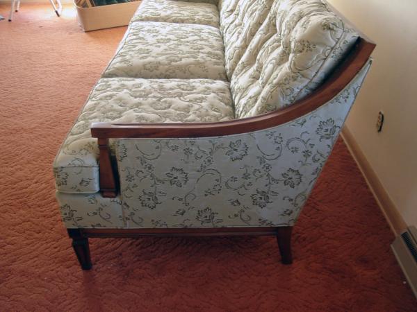 This sofa is light sage in color with a darker floral embroidery. No scratches, no tears in fabric, very solid and hardly looks used. Does anyone have any more info and approx. value of this piece?